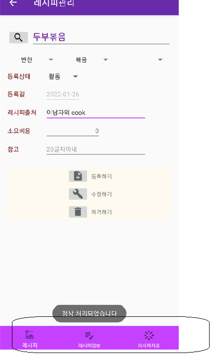 레시피탭은 레시피노트 내용이고, 레시피정보탭은 레시피등록기본정보, 레시피재료탭은 레시피에서 사용되는 식재료정보를 각각 등록관리하는 기능을 갖습니다.