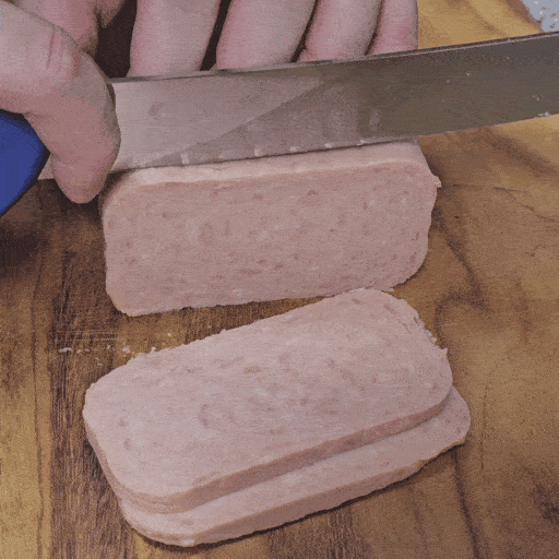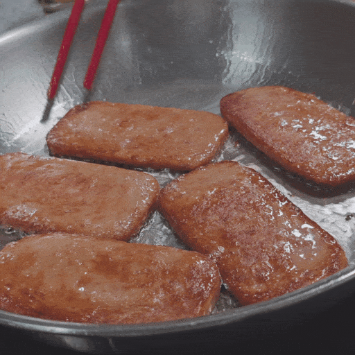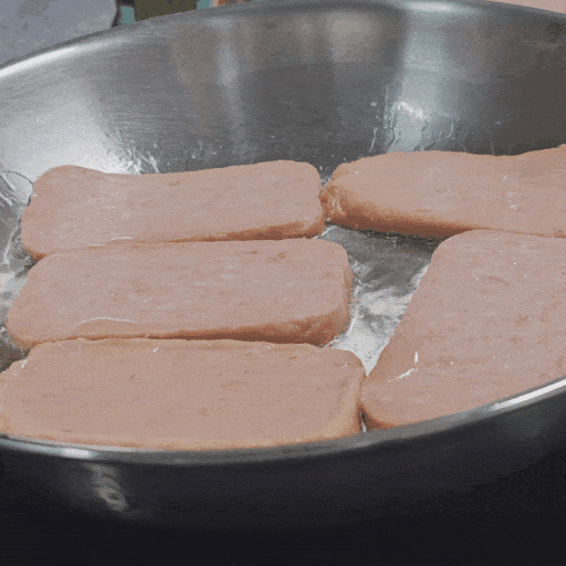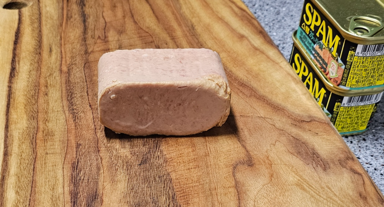 스팸의 경우 잘 구우면 겉이 바삭해지면서 마치 껍데기가 형성된 것 처럼 익어