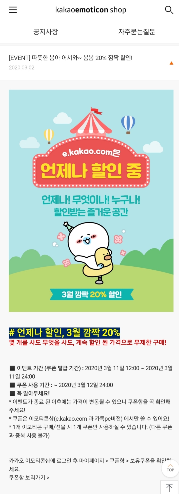 [짧은생활정보]카카오톡 이모티콘 20% 할인 작성자실버|작성시간20.03.02|조회수734 목록 댓글 34 글자크기 작게가 글자크기 크게가 쿠폰 발급 기간은 3월 11일 24:00까지쿠폰 사용은 3월 12일 24:00까지카카오 이모티콘샵 http://me2.do/GoZ3tVkl 이랑 PC버전에서만 구매할 수 있대 다음검색 현재 게시글 추가 기능 열기 북마크 공유하기 신고 센터로 신고 댓글 댓글 34 댓글쓰기 답글쓰기 댓글 리스트 작성자CLASSIC | 작성시간 20.03.04 할 ㄱㅅㄱㅅ 작성자이케아산토끼 | 작성시간 20.03.04 따냥고 작성자야채부락리 | 작성시간 20.03.04 오 ㄱㅅㄱㅅ 작성자Jelly | 작성시간 20.03.04 따냥고 작성자American Money | 작성시간 20.03.05 ㄱㅅㄱㅅ 댓글 전체보기
