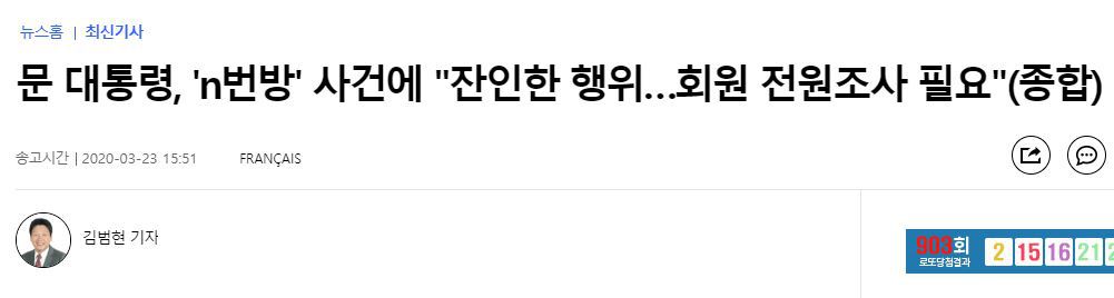 김범현, 「문 대통령, 'n번방' 사건에 "잔인한 행위...회원 전원조사 필요"(종합)」, 연합뉴스, 2020. 03. 23.