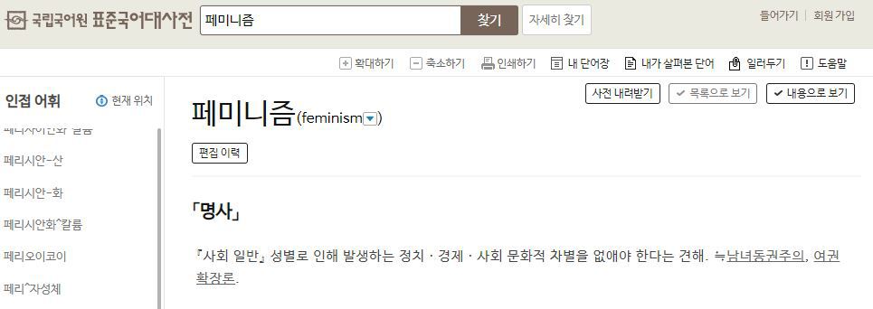 페미니즘, 국립국어원표준국어대사전, 2018. 07. 19, 2020. 03. 23, https://stdict.korean.go.kr/search/searchView.do?word_no=350836&searchKeywordTo=3