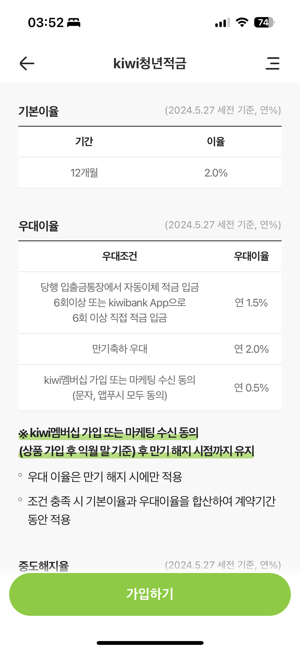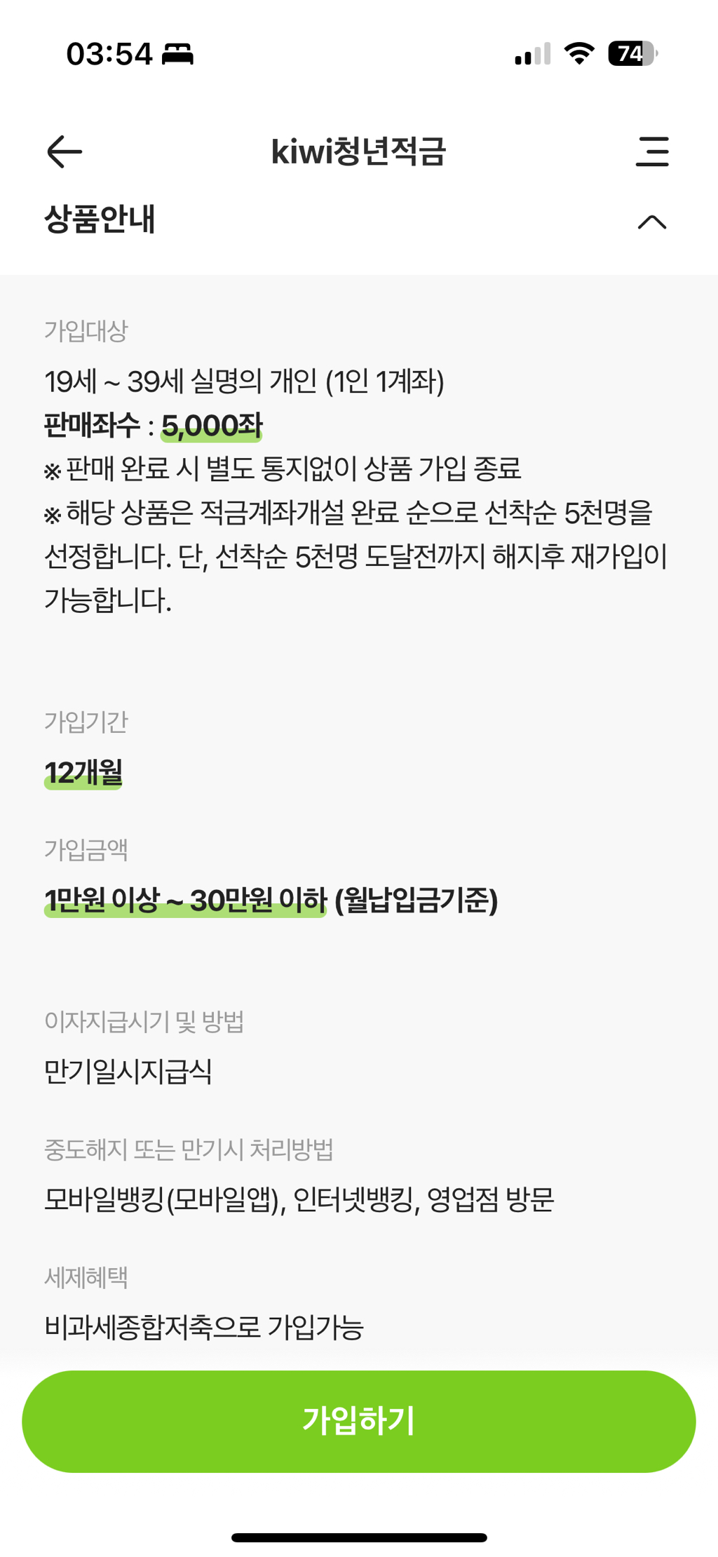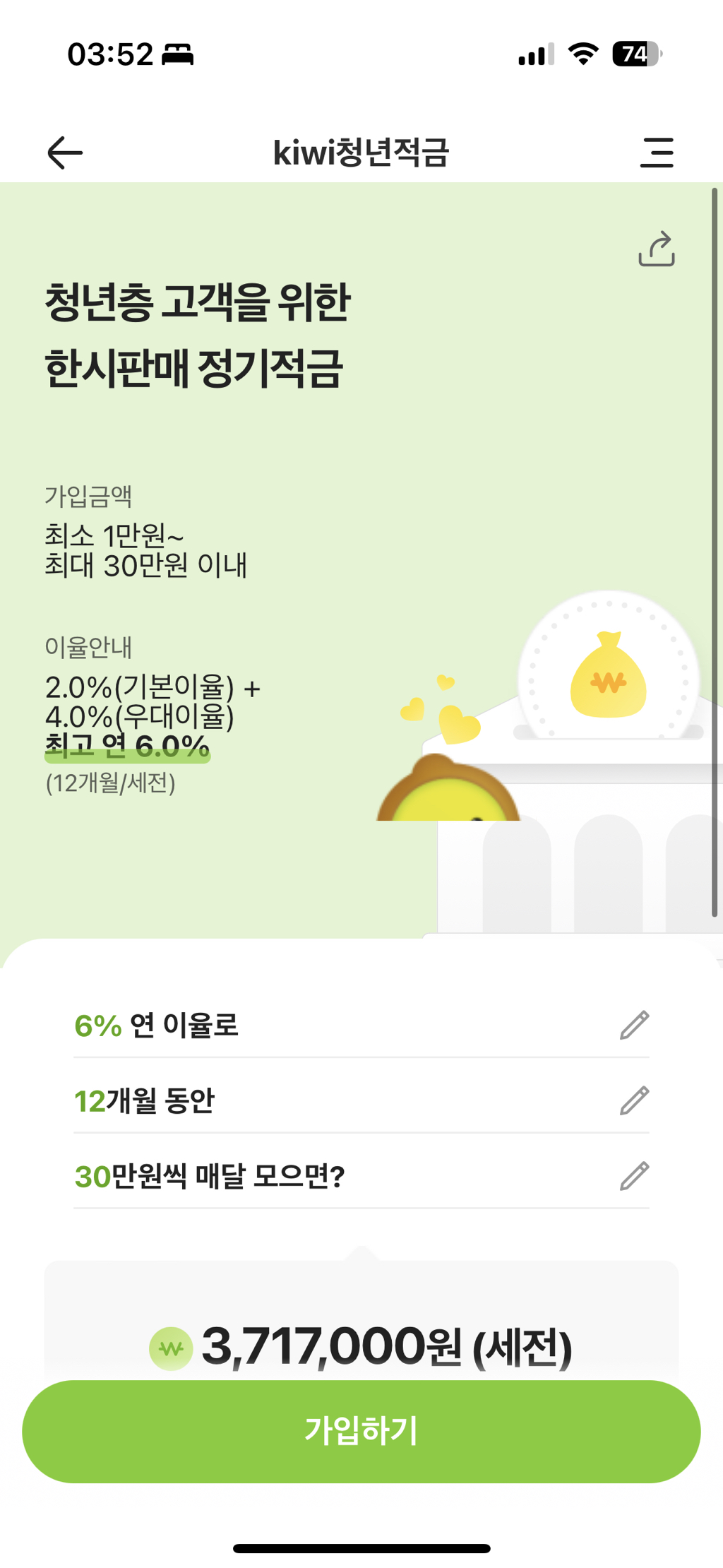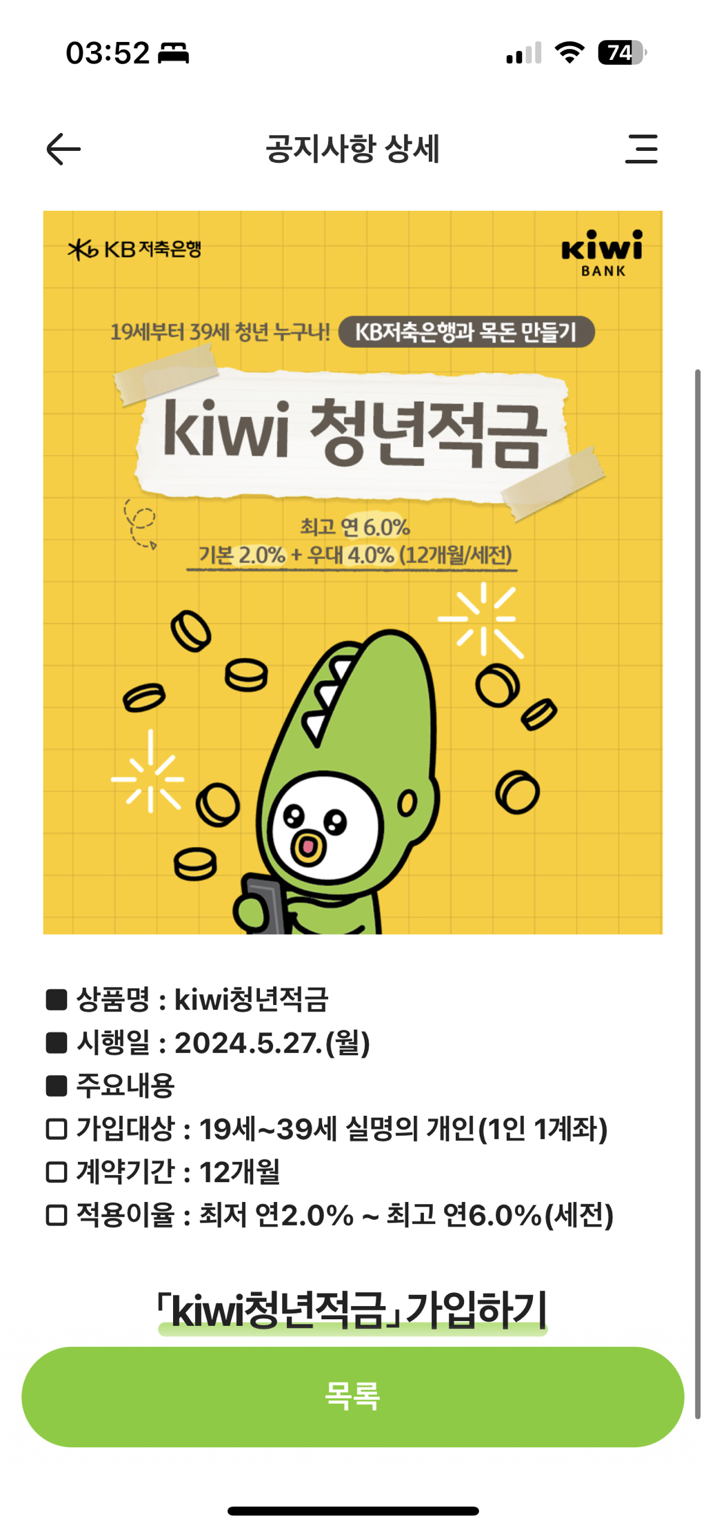 [경제]kb저축은행 <청년적금> 최대이율 6% 선착순 5,000좌 작성자인사|작성시간24.06.12|조회수1,980 목록 댓글 13 글자크기 작게가 글자크기 크게가 kb저축은행(=kiwi뱅크)에6퍼센트대 적금 상품 있길래 공유하잔아- 대상: 19~39세 청년- 기간: 12개월- 이율: 2.0%~6.0%- 우대조건: 1) 만기 시 축하 우대금리 / 2) 6회 이상 적금 자동이체(또는 입금) / 3) 문자, 앱푸시 동의(만기까지 유지)- 가입 금액: 1만원~30만원 (만기시 3,717,000)자세한 사항은 아래 캡처 참고!!선착 5천좌라고 하는데 아직 가입 되덜아가입할 사람은 만들어두라잔아 다음검색 현재 게시글 추가 기능 열기 북마크 공유하기 신고 센터로 신고 댓글 댓글 13 댓글쓰기 답글쓰기 댓글 리스트 작성자윤은혜 | 작성시간 24.06.12 따냥고 만들었다! 작성자Eiffel Tower | 작성시간 24.06.12 가입완 따냥고 작성자wiwh | 작성시간 24.06.13 만기시 371만인데 오타난거같잔아 당장만들러간다~~~~ 답댓글 작성자인사 작성자 본인 여부 작성자 | 작성시간 24.06.13 앗 그러네 (〃⌒▽⌒〃)ゝ 수정 오나료 작성자고약한개구리 | 작성시간 24.06.13 따냥고~~~ 댓글 전체보기
