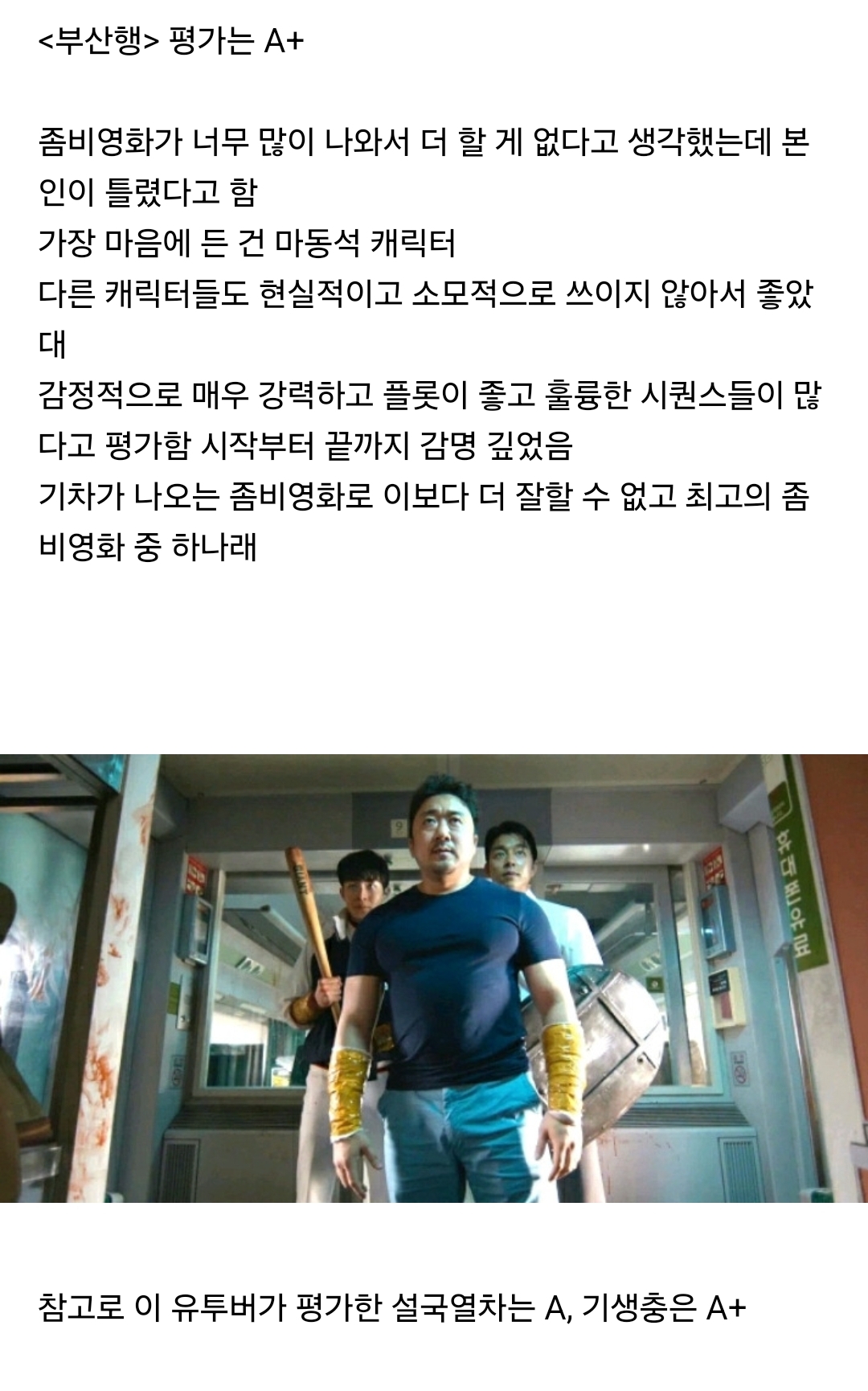 알 수 없는 동아리⠀ [기타]영화평론가 크리스 스턱만의 <부산행> 평가.jpg 작성시간24.11.21|조회수2,115 목록 댓글 2 글자크기 작게가 글자크기 크게가 https://youtu.be/cPjOUdeJC7M?si=IGlWoceso2aJaYnz 다음검색 현재 게시글 추가 기능 열기 북마크 공유하기 신고 센터로 신고 댓글 2 댓글 리스트 작성시간 24.11.21 나도 잼게 봣는데 ㅋㅋㅋ 부산행 신파라고 하더라? 그래도 재밋엇음.. 작성시간 24.11.21 나도 부산행 좋아해 마지막에 공유 분유 광고st 장면만 제외하면 크게 신파도 못 느꼈는데 카페 방문해 더 많은 댓글 만나기!