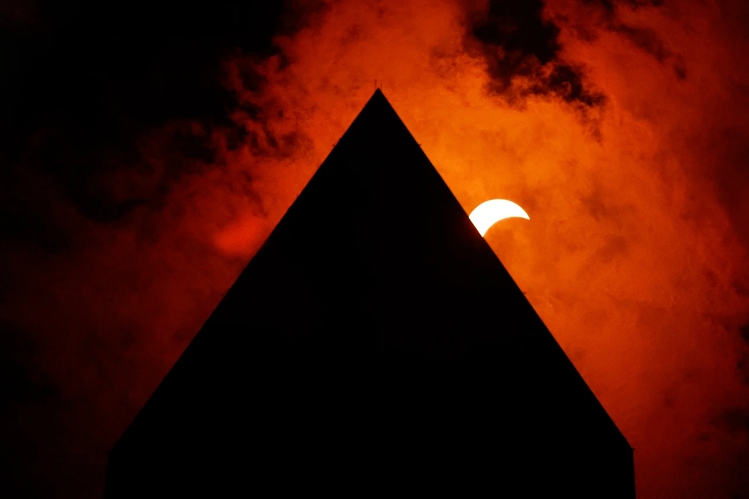 2024년 4월 개기일식 행사에서 부분일식 중인 태양과 함께 실루엣으로 보이는 워싱턴 기념탑의 끝 부분