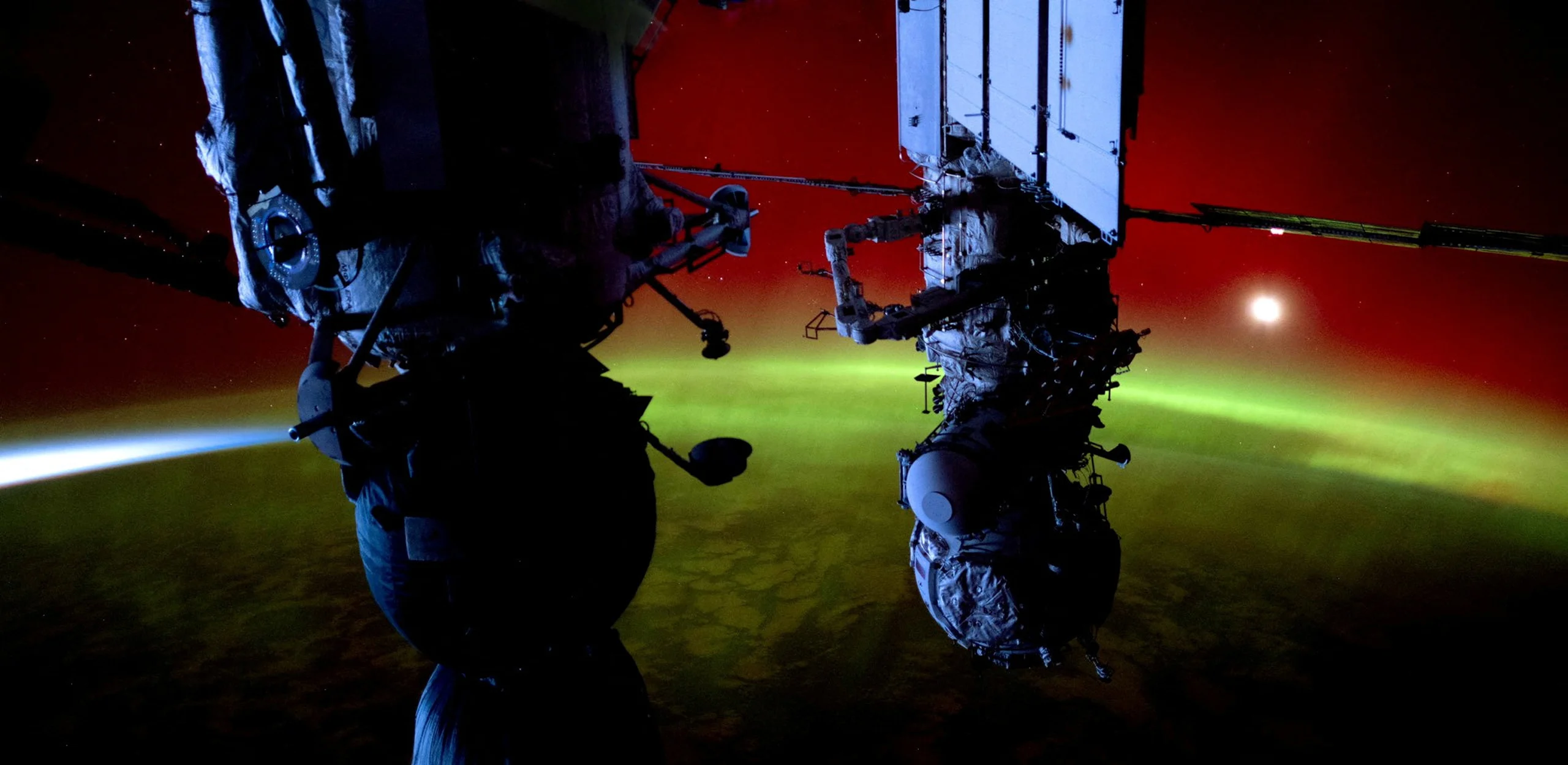 국제우주정거장에서 바라본 오로라는 지구 대기 상공에 붉은색과 초록색으로 보였다