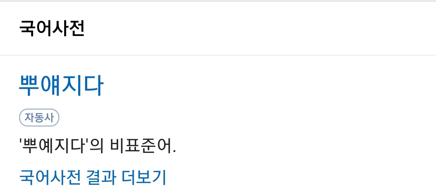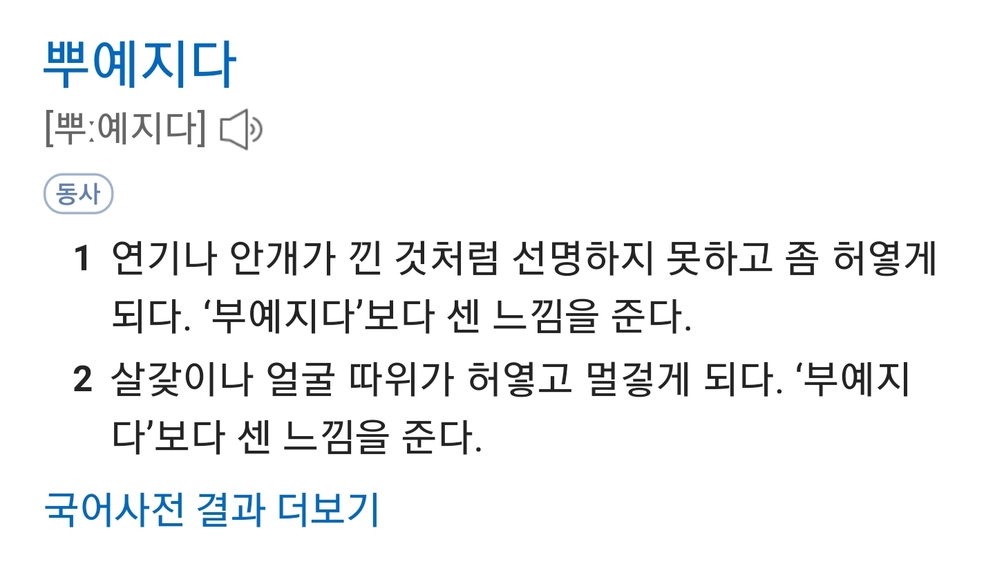 [기타]뿌얘지다는 알고보니 비표준어 작성자추억|작성시간20.05.26|조회수734 목록 댓글 36 글자크기 작게가 글자크기 크게가 뿌얘지다 (X)뿌예지다 (O) 다음검색 현재 게시글 추가 기능 열기 북마크 공유하기 신고 센터로 신고 댓글 댓글 36 댓글쓰기 답글쓰기 댓글 리스트 작성자bakc | 작성시간 20.05.26 뿌옇다 작성자덕질 | 작성시간 20.05.26 할 작성자엑설런트 | 작성시간 20.05.26 헐뿌예 작성자강이지 | 작성시간 20.05.26 ㅁㅊ 뻥치지마!!!! (넝담임 작성자손유동 | 작성시간 20.05.26 양성모음은 양성모음끼리 음성모음은 음성모음끼리 써야해서 그럴걸?? ㅜ + ㅖ, ㅗ + ㅒ 노랗다 누렇다 퍼렇다 파랗다 벌겋다 발갛다 속닥속닥 숙덕숙덕!! 댓글 전체보기