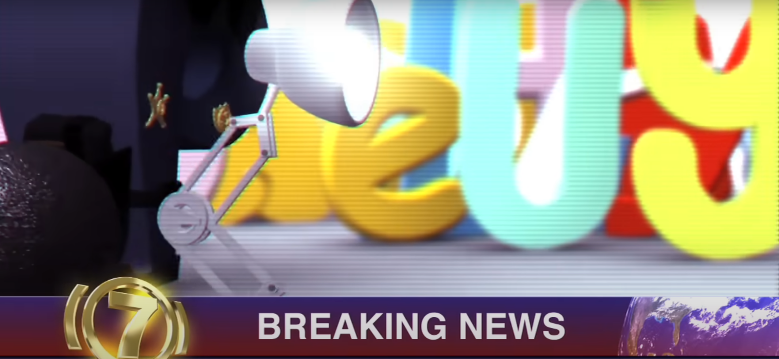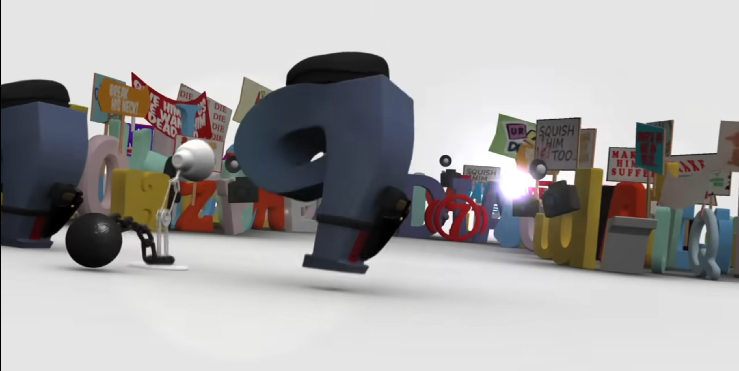 피켓을 들며 픽사 조명을 질책하는 알파벳들과 사진 찍는 기자들