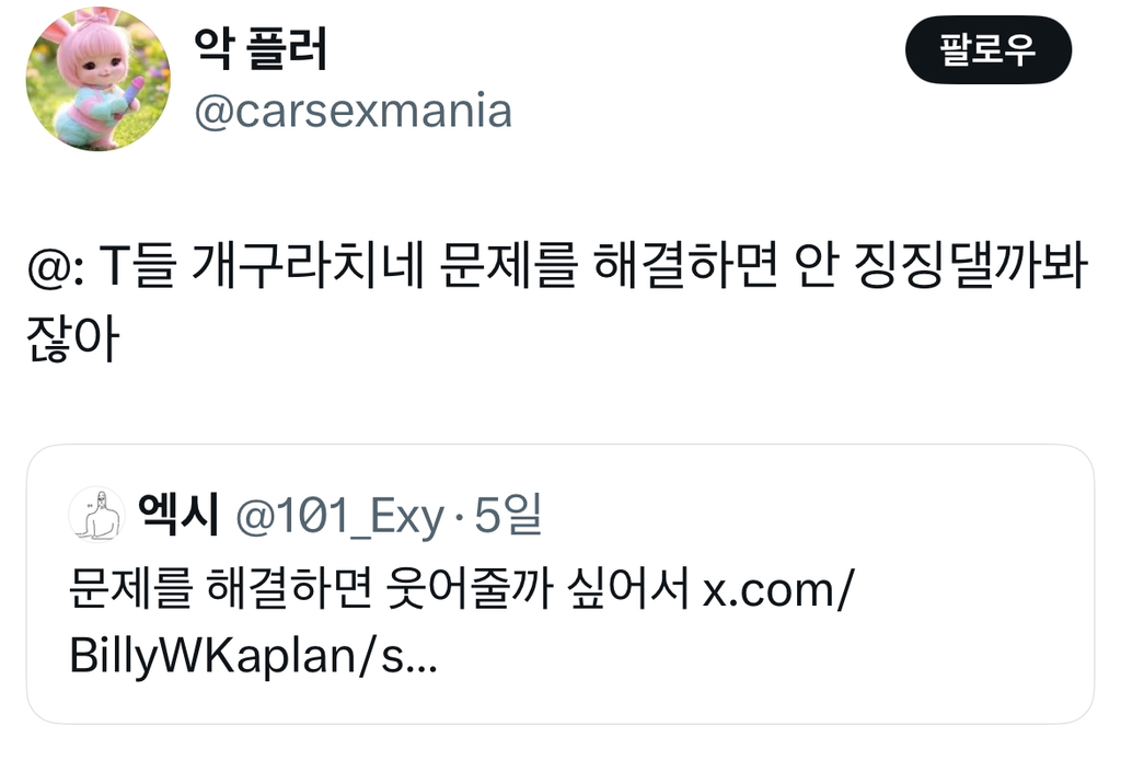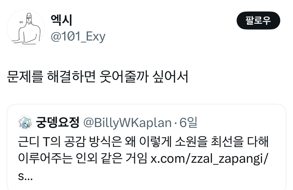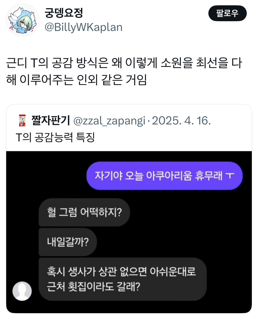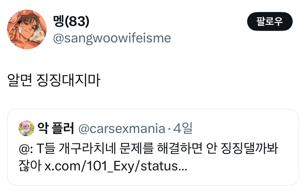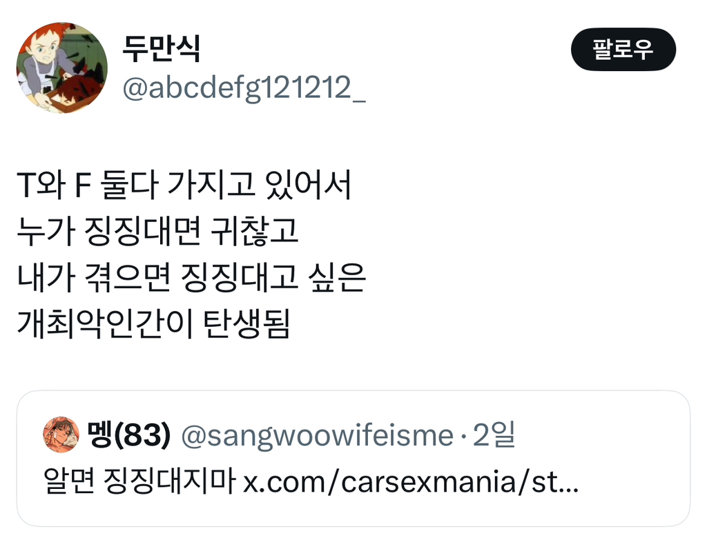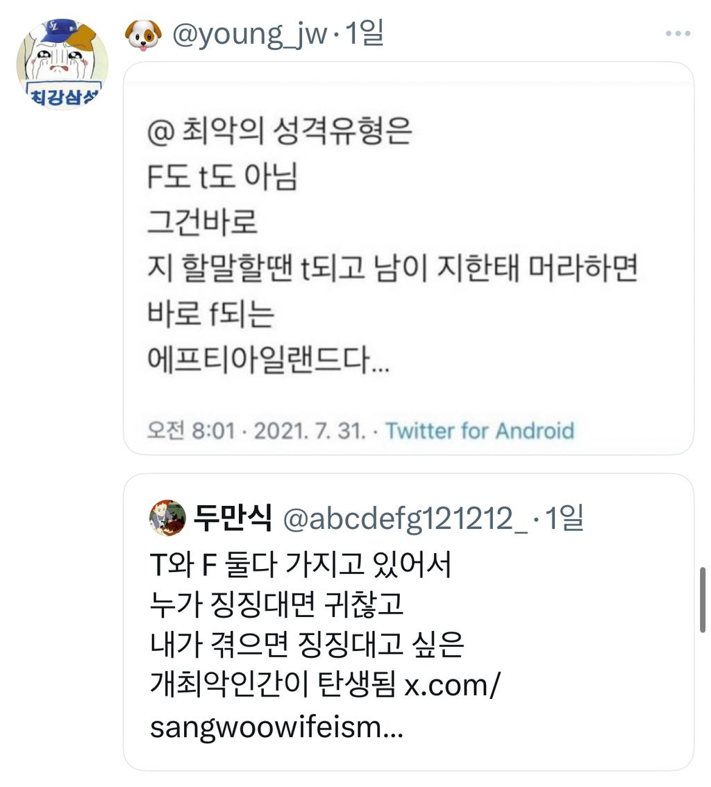 알 수 없는 동아리⠀ [흥미]최악의 성격유형은 f도 t도 아님 작성시간25.04.24|조회수5,144 목록 댓글 8 글자크기 작게가 글자크기 크게가 다음검색 현재 게시글 추가 기능 열기 북마크 공유하기 신고 센터로 신고 댓글 8 댓글 리스트 답댓글 작성시간 25.04.24 ㅅㅂㅋㅋㅋㅋㅋㅋ 작성시간 25.04.24 ㅋㅋㅋ개웃기고 사실 나야 엄마한정 작성시간 25.04.24 저래서 쿨한 t만 좋음.. 삭제된 댓글입니다. 답댓글 작성시간 25.04.24 인간외 드래곤 외계인 a.i 등등 걍 인간아닌 모든거!! 오타쿠표현일걸?? 카페 방문해 더 많은 댓글 만나기!