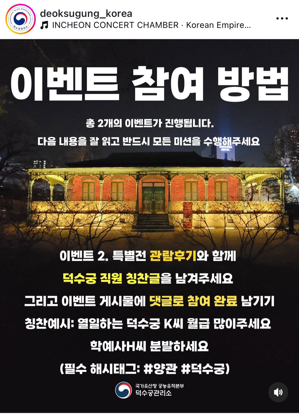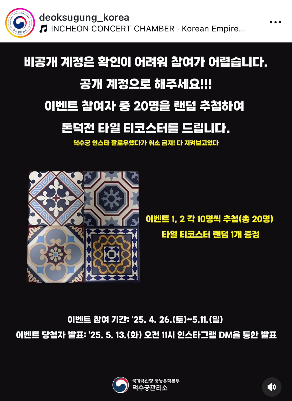[스크랩] [기타]덕수궁 인스타그램 이벤트(비매품 기념품) 작성자과자|작성시간25.04.26|조회수2,809 목록 댓글 2 글자크기 작게가 글자크기 크게가 출처: https://www.instagram.com/p/DI46s5FyPX4특별전 전용으로 나온 돈덕전 타일 티코스터 주는 이벤트함 다음검색 스크랩 원문 : *여성시대* 차분한 20대들의 알흠다운 공간 현재 게시글 추가 기능 열기 북마크 공유하기 신고 센터로 신고 댓글 댓글 2 댓글쓰기 답글쓰기 댓글 리스트 작성자쉬꼬 | 작성시간 25.04.26 열일하는 덕수궁 K씨 월급 많이주세요학예사씨 분발하세요효도참여완료티코스터주세요 작성자외계 | 작성시간 25.04.26 오우예씨몬 어차피 가야되 ㅋ 댓글 전체보기