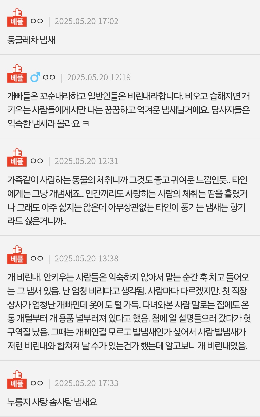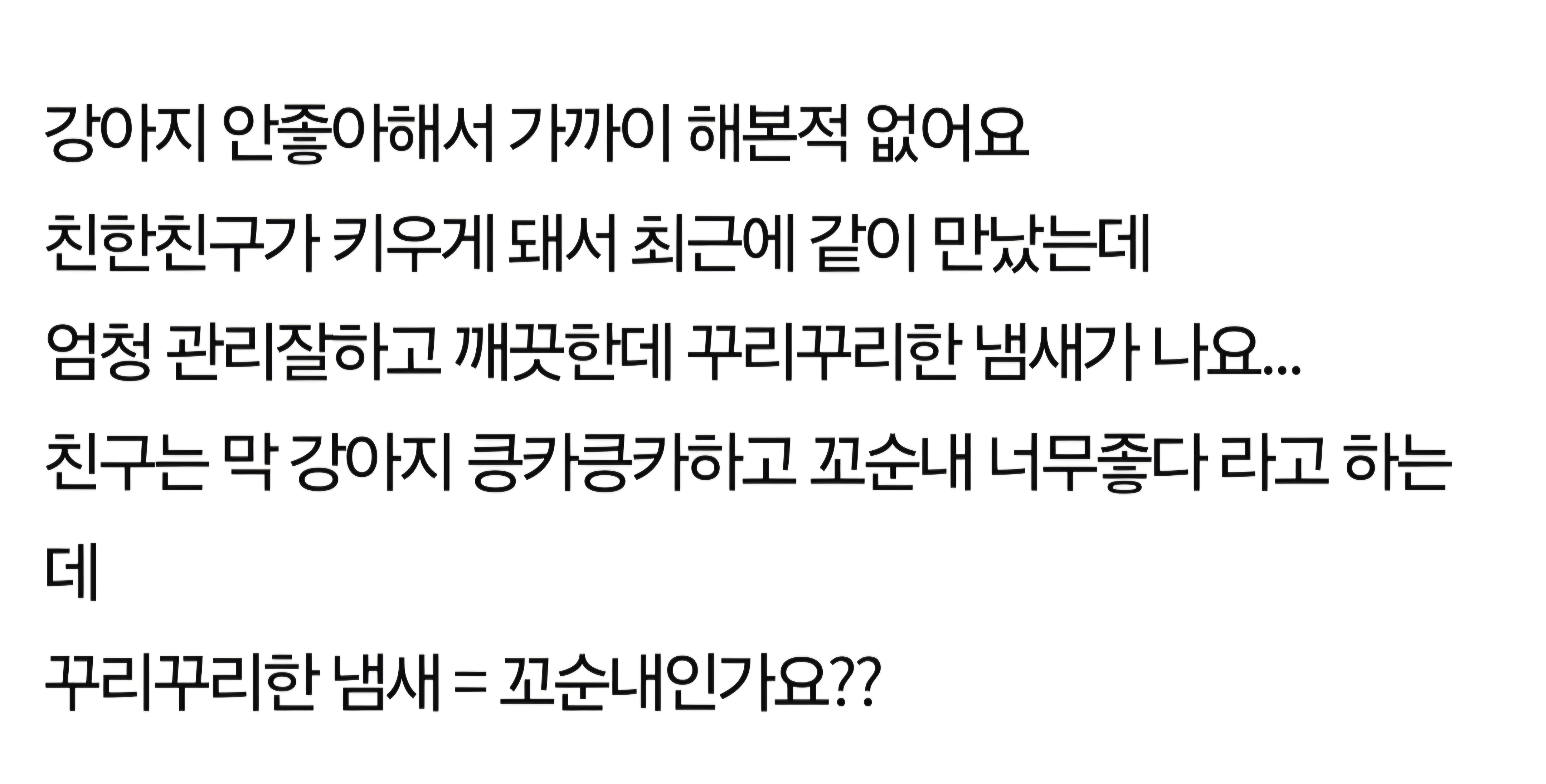 우리집 개는 나갔다 오면 비린내 나고 자고 일어났을때 꼬순내 폭발함 -