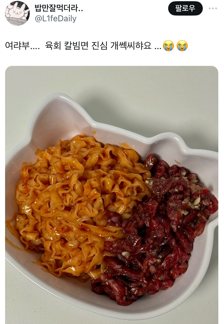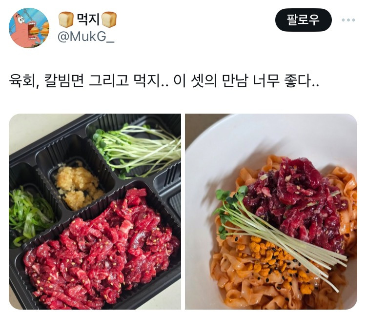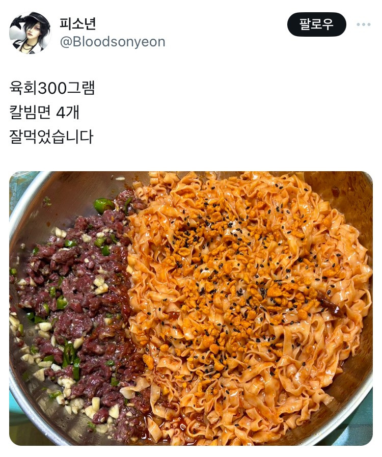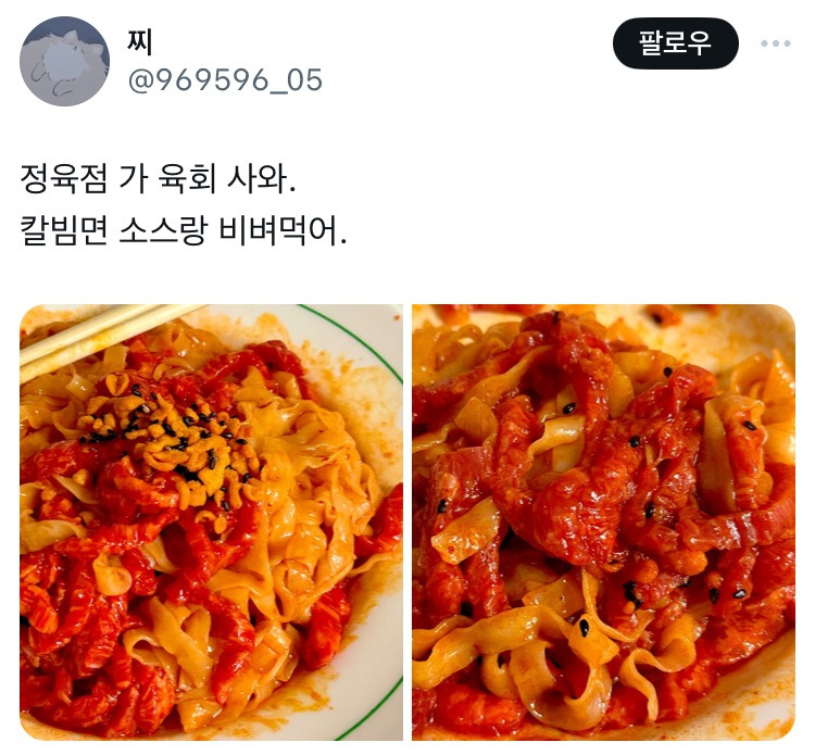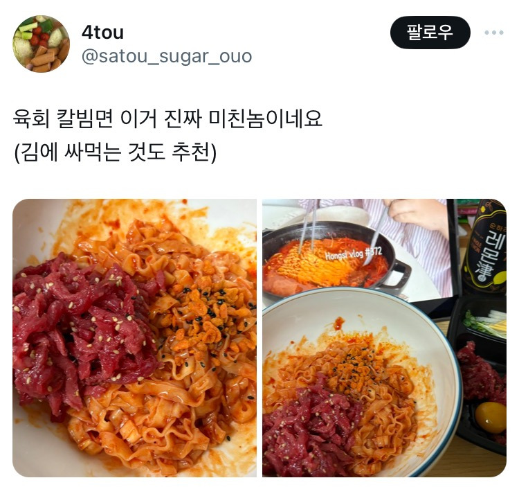 [스크랩] [기타]미쳤다는 육회 칼빔면 조합.twt 작성자과자|작성시간25.05.31|조회수2,722 목록 댓글 2 글자크기 작게가 글자크기 크게가 《 우리 동네 목욕탕 / 출소 후 우동탕이 유일한 낙입니다 》 다음검색 스크랩 원문 : 우리 동네 목욕탕 현재 게시글 추가 기능 열기 북마크 공유하기 신고 센터로 신고 댓글 댓글 2 댓글쓰기 답글쓰기 댓글 리스트 작성자여장폰쮸 | 작성시간 25.05.31 이렇게 먹엇는데 맛잇더라 칼빔면이 육회 맛을 안 덮고 오히려 살리잔아 작성자김람우 | 작성시간 25.05.31 먹짱 진짜 많다 댓글 전체보기