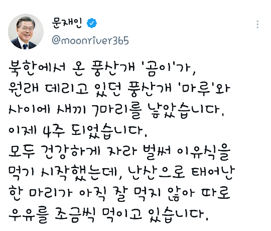 [스크랩] [기타]현재 문재인 전 대통령이 키우고 있는 가나디 작성자과자|작성시간25.07.03|조회수977 목록 댓글 10 글자크기 작게가 글자크기 크게가 출처: 여성시대 메론거북이퇴임 초에는 6마리의 반려동물이 있었는데강아지는 다운이 한마리만 남음ㅠㅠㅠㅠㅠㅠ다운이는 청와대에서 태어난 강아지임(곰이 새끼)👇난산으로 태어난 한마리가 다운이임!문프가 밥주고 있는 강아지가 다운이 추정이렇게 자라서늠름해짐왕크 왕귀 다음검색 스크랩 원문 : *여성시대* 차분한 20대들의 알흠다운 공간 현재 게시글 추가 기능 열기 북마크 공유하기 신고 센터로 신고 댓글 댓글 10 댓글쓰기 답글쓰기 댓글 리스트 작성자YUNA KIM | 작성시간 25.07.03 하 개귀여워 으아 작성자Mackenzie Foy | 작성시간 25.07.03 개귀여워 ㅁㅊ ㅠㅠㅠㅠ 작성자아케치 | 작성시간 25.07.03 ㄱㅇㅇ 작성자movieee | 작성시간 25.07.03 약간 달님 닮앗어 ㅋㅋㅋㅋㅋㅋㅋㅋㅋㅋㅋㅋㅋㅋㅋㅋㅋㅋㅋㅋ 작성자토시리 | 작성시간 25.07.04 눈이 되게 사람 같다 댓글 전체보기