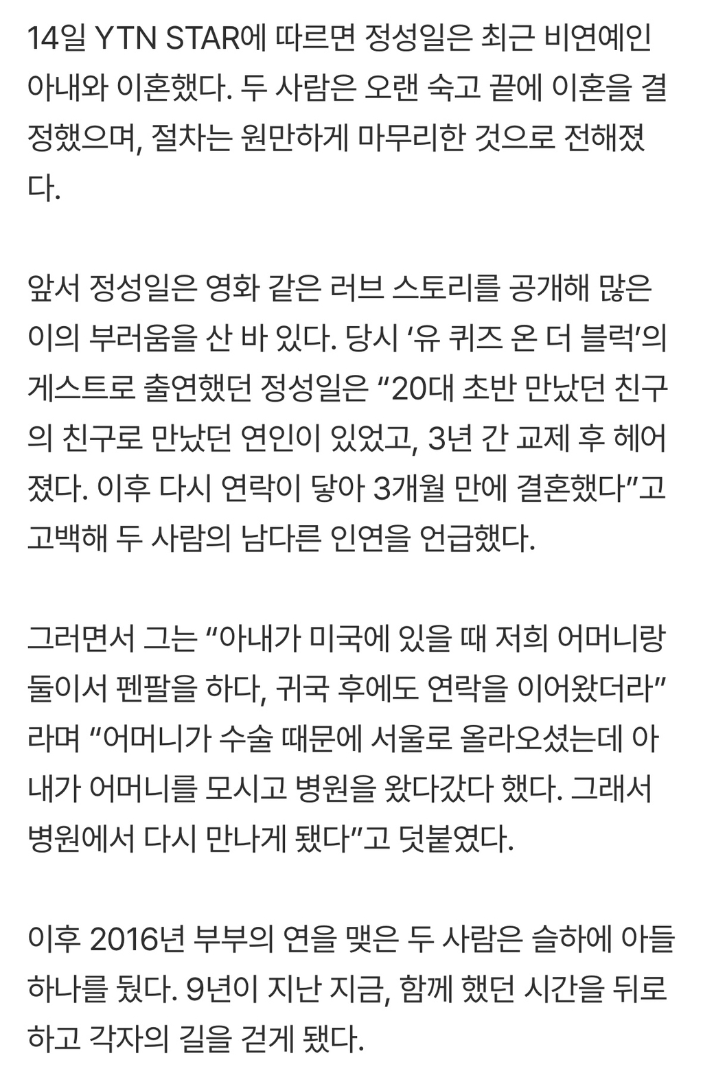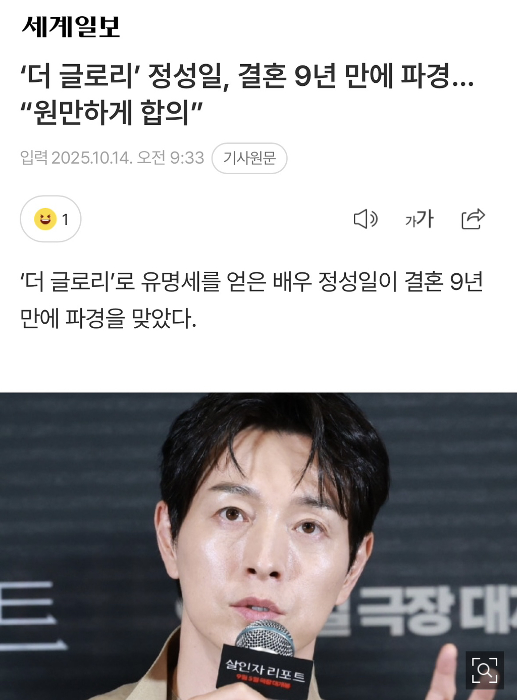 [연예]’더 글로리’ 정성일, 결혼 9년 만에 파경…“원만하게 합의” 작성자씨야|작성시간25.10.15|조회수9,746 목록 댓글 8 글자크기 작게가 글자크기 크게가 출처 https://m.entertain.naver.com/home/article/022/0004074761‘더 글로리’ 정성일, 결혼 9년 만에 파경…“원만하게 합의”여기를 눌러 링크를 확인하세요m.entertain.naver.com 다음검색 현재 게시글 추가 기능 열기 북마크 공유하기 신고 센터로 신고 댓글 댓글 8 댓글쓰기 답글쓰기 댓글 리스트 작성자평안과사랑과평화 | 작성시간 25.10.15 ㅠㅠ ... 작성자꼴골골곤골골꼴꼵꼸 | 작성시간 25.10.15 다들 몰랐단 말이야?? 아들도 있는데 ㅋㅋㅋㅋ 작성자movieee | 작성시간 25.10.15 헐.. 작성자박준순 | 작성시간 25.10.15 결혼을 헷엇어…? 작성자단결 | 작성시간 25.10.24 아들도잇엇다거...??? 댓글 전체보기