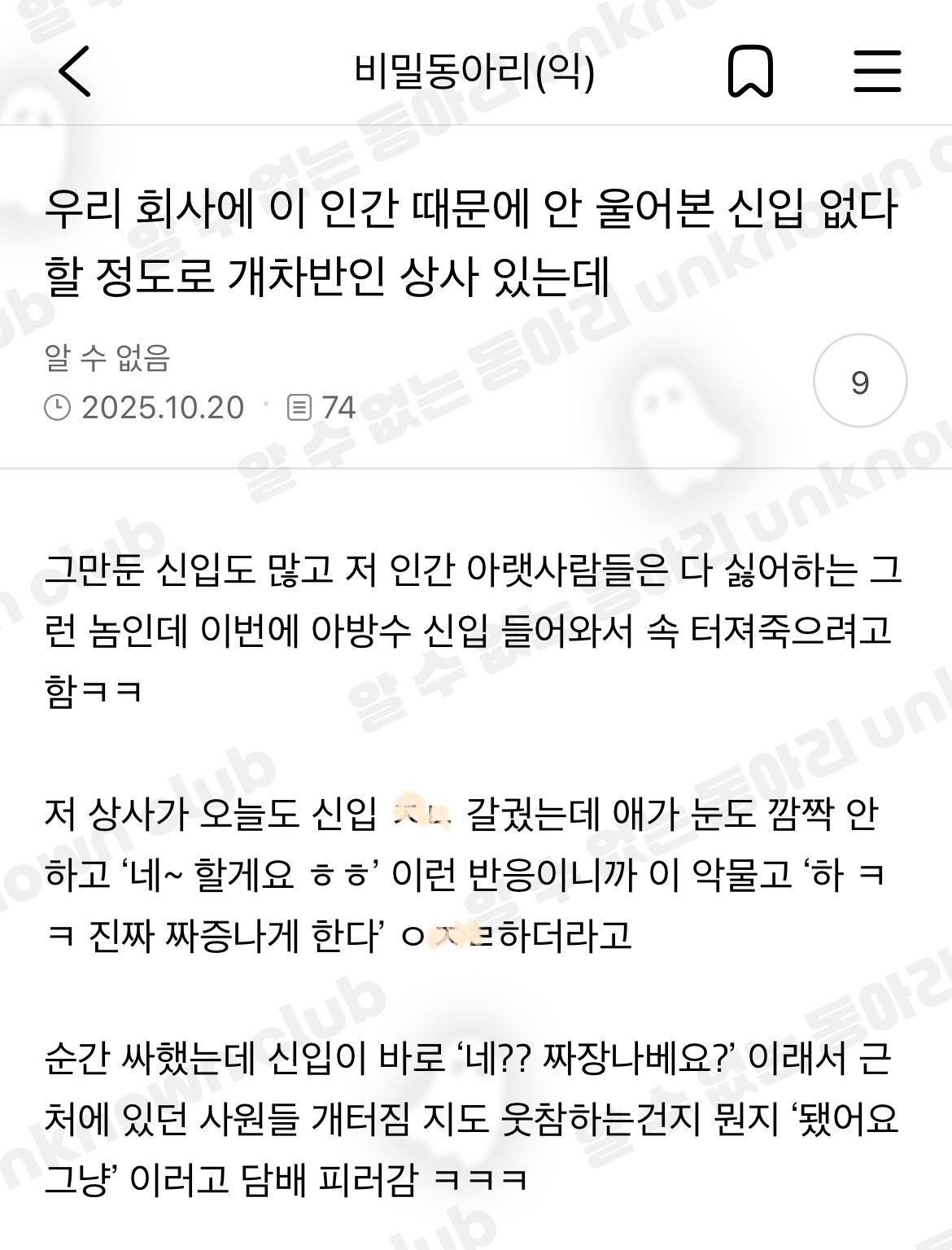 [알zip]우리 회사에 이 인간 때문에 안 울어본 신입 없다 할 정도로 개차반인 상사 있는데 작성자은찬|작성시간25.10.21|조회수17,737 목록 댓글 27 글자크기 작게가 글자크기 크게가 다음카페 <알 수 없는 동아리> - [미스터리 신문부] 게시판 스크랩O 퍼가기X 다음검색 현재 게시글 추가 기능 열기 북마크 공유하기 신고 센터로 신고 댓글 댓글 27 댓글쓰기 답글쓰기 댓글 리스트 작성자으녕이 | 작성시간 25.10.22 네?? 짜장나베요? 작성자공케이 | 작성시간 25.10.22 ㅋㅋㅋㅋㅋㅋㅋㅋㅋㅋ ㅋㅅㅂ 작성자토란소년 | 작성시간 25.10.30 네?? 짜장나베요? 작성자가쿠 | 작성시간 25.10.31 아 씨발 ㅋㅋㅋㅋㅋㅋ 작성자물비 | 작성시간 25.11.01 네?? 짜장나베요? 댓글 전체보기