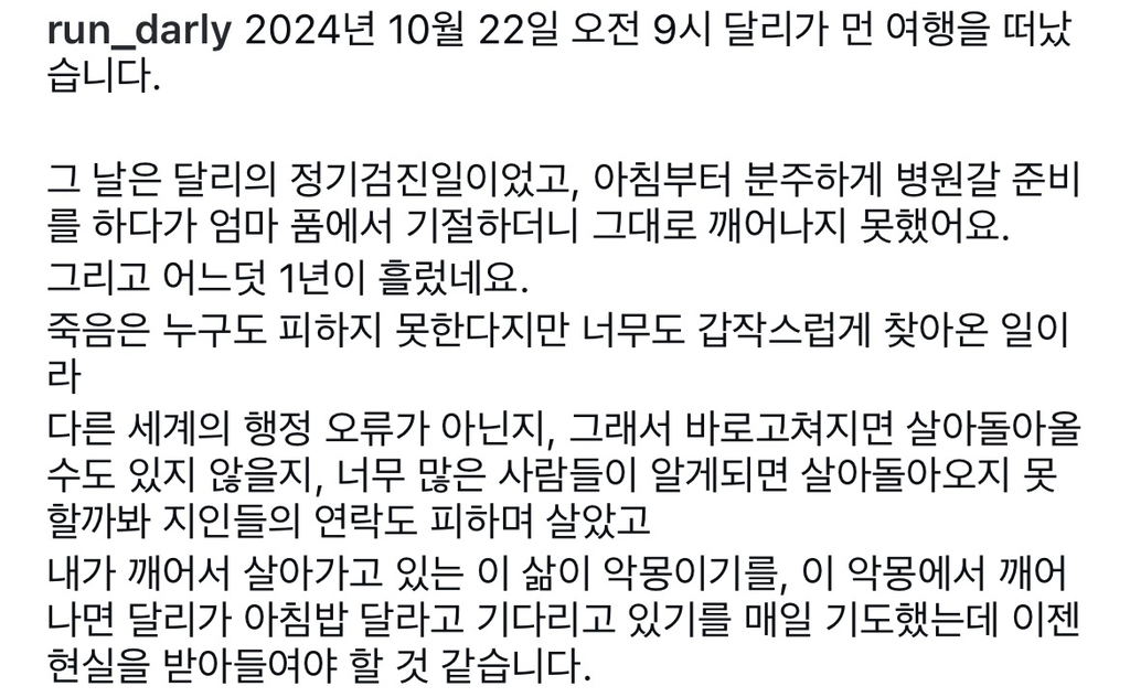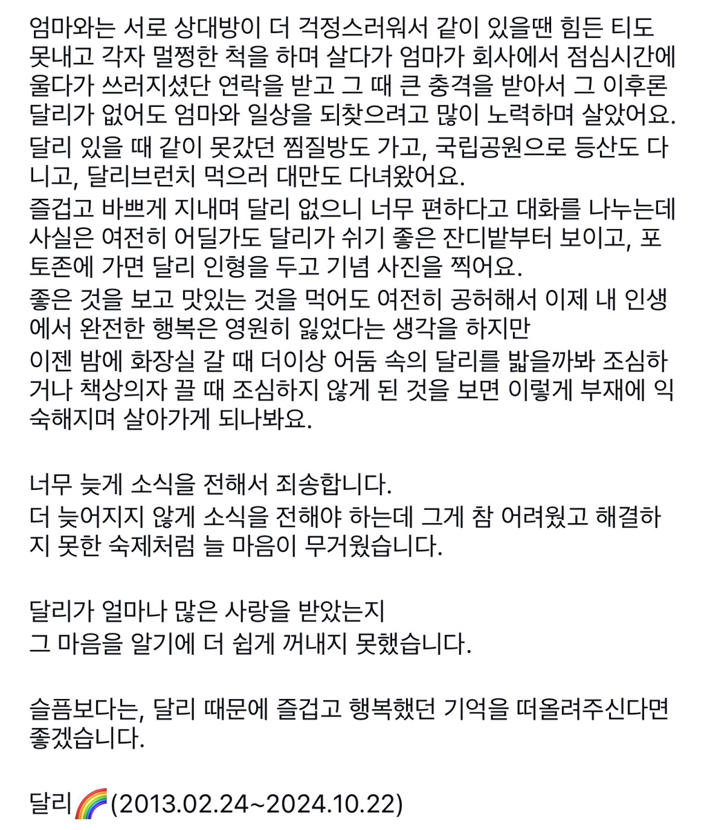 [기타]강아지별로 떠난 달리 작성자춘 식|작성시간25.10.21|조회수3,495 목록 댓글 15 글자크기 작게가 글자크기 크게가 달리야 강아지별에서는 친구들이랑 마음껏 뛰어놀렴 다음검색 현재 게시글 추가 기능 열기 북마크 공유하기 신고 센터로 신고 댓글 댓글 15 댓글쓰기 답글쓰기 댓글 리스트 작성자VANILLA | 작성시간 25.10.22 달리야 고마워 사랑해 작성자오키키 | 작성시간 25.10.22 달리야 행복해 신나게 놀고 나중에 언니랑 다시 만나 작성자Nct김정우 | 작성시간 25.10.22 달리벌써 1년이구나 보고싶다 행복해야해 작성자YUNA KIM | 작성시간 25.10.22 달리야 잘 지내고 있지? 아프지말고 늘 건강하고 행복하길 바라 사랑해 작성자권유리 | 작성시간 25.10.22 달리야 행복해야해 댓글 전체보기