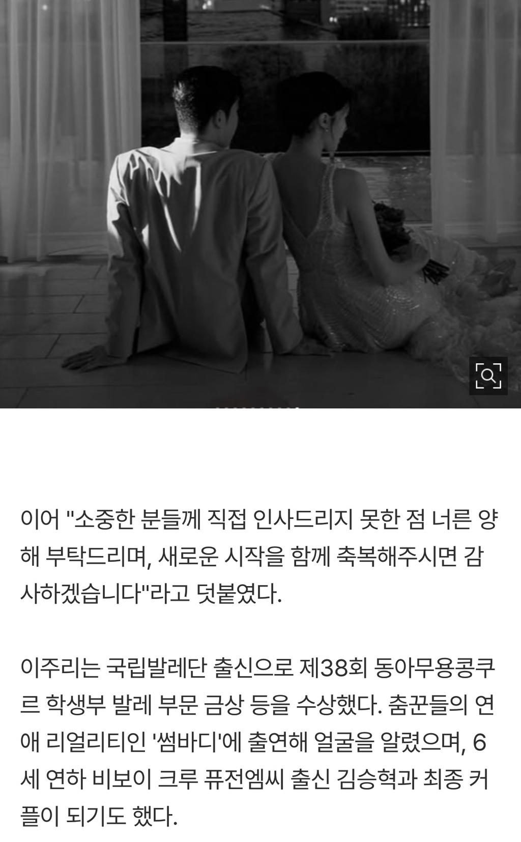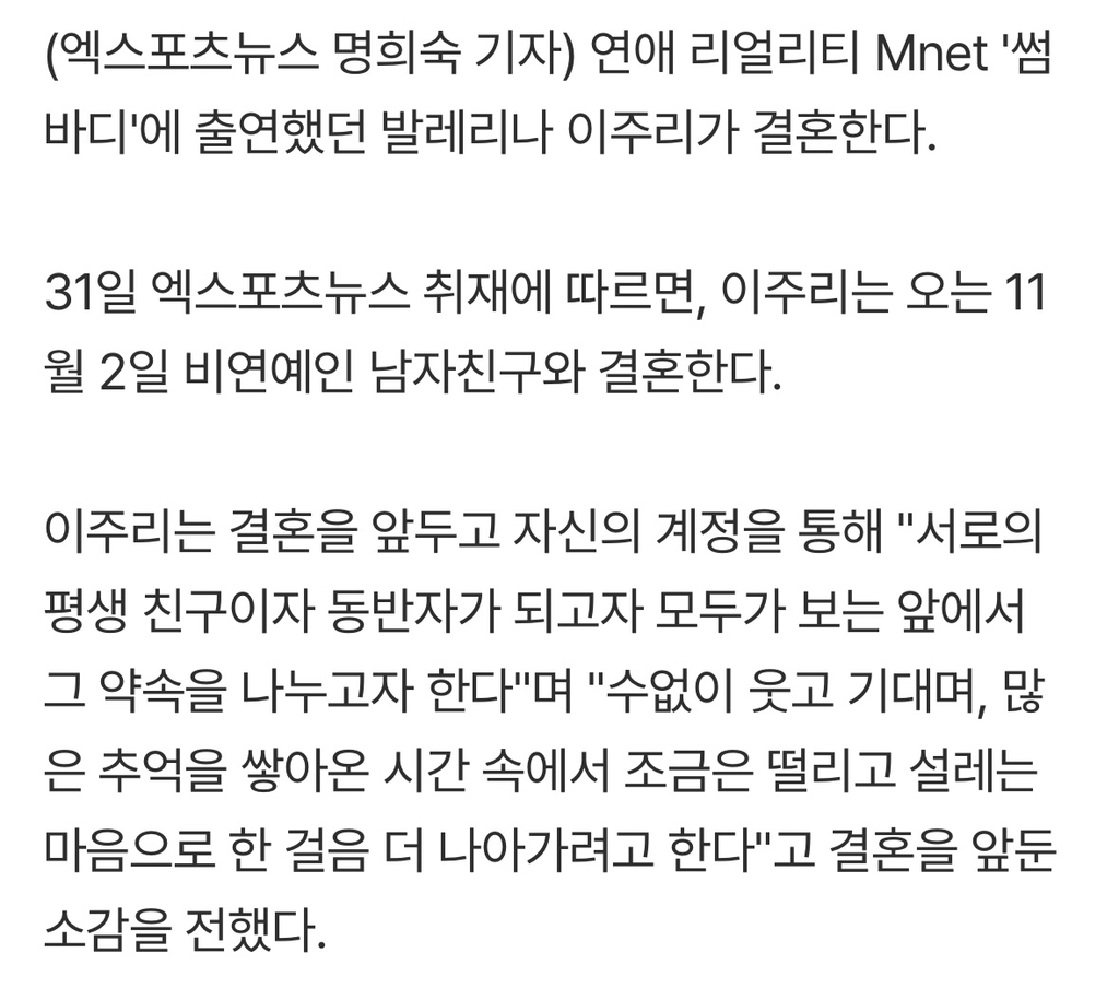 [기타][단독] '썸바디' 발레리나 이주리, 11월 2일 결혼 '품절녀 된다' 작성자씨야|작성시간25.10.31|조회수4,157 목록 댓글 3 글자크기 작게가 글자크기 크게가 출처 https://m.entertain.naver.com/home/article/311/0001936179[단독] '썸바디' 발레리나 이주리, 11월 2일 결혼 '품절녀 된다'여기를 눌러 링크를 확인하세요m.entertain.naver.com 다음검색 현재 게시글 추가 기능 열기 북마크 공유하기 신고 센터로 신고 댓글 댓글 3 댓글쓰기 답글쓰기 댓글 리스트 작성자강아지가 세상을 구한다 | 작성시간 25.10.31 주리눈아 행ㅂ복해요.. 작성자멧지 | 작성시간 25.10.31 헐 내 최애였는머ㅜ.ㅜ 잘살아요 ,.,. 작성자우리집보다 김휘집 | 작성시간 25.10.31 눈아 ㅠ 댓글 전체보기