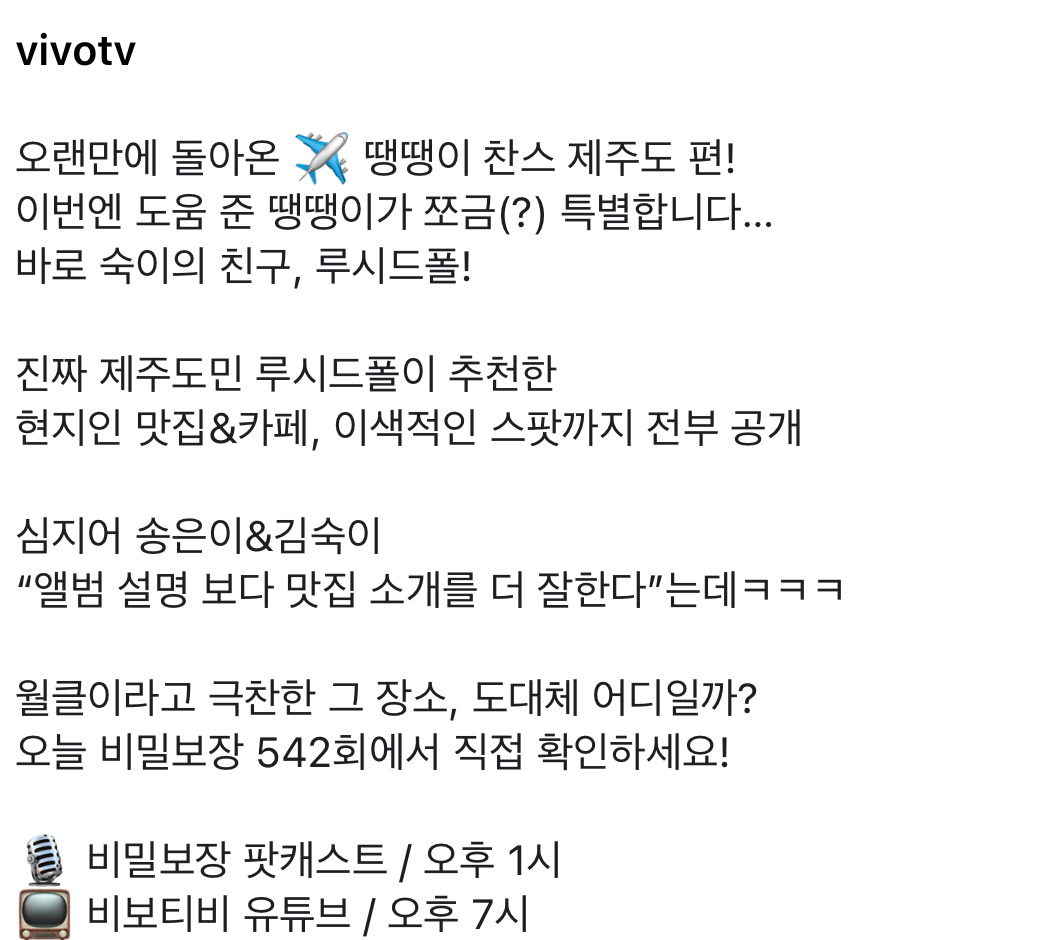 [스크랩] [기타]진짜 제주도민 루시드폴이 추천한 현지인 맛집&카페 작성자과자|작성시간25.11.08|조회수5,005 목록 댓글 5 글자크기 작게가 글자크기 크게가 출처: https://www.instagram.com/p/DQqOTjljEFZ 다음검색 스크랩 원문 : *여성시대* 차분한 20대들의 알흠다운 공간 현재 게시글 추가 기능 열기 북마크 공유하기 신고 센터로 신고 댓글 댓글 5 댓글쓰기 답글쓰기 댓글 리스트 작성자주윤발 | 작성시간 25.11.08 맛있겠다 작성자오뎅 | 작성시간 25.11.08 성이시돌은 맛집!! 이라기보단 앞에 풍경도 좋고 맛도 ㄱㅊ아서 근처면 가보는 거 ㅊㅊ 작성자자취 | 작성시간 25.11.08 성이시돌 볼거럾던데.. 답댓글 작성자자취 | 작성시간 25.11.08 그냥 지나가다가 잠깐 차세워서 볼 정도 작성자상폰수 | 작성시간 25.11.08 스시우다 꼭 가봐야지..그나저나 제주도민이었념 댓글 전체보기