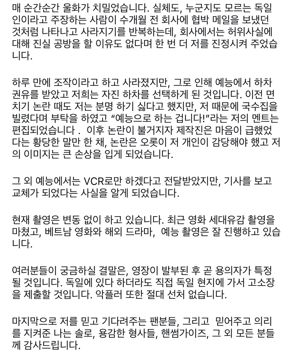 작성자HAERIN 작성시간 25.11.22 그냥 고소글만 쓰던가 본인도 놀뭐하면서 하차통보 받은 연예인들 봤으면서 저러네 저렇게 프로그램 저격하면 누가 본인쓰고 싶어하겠음..?