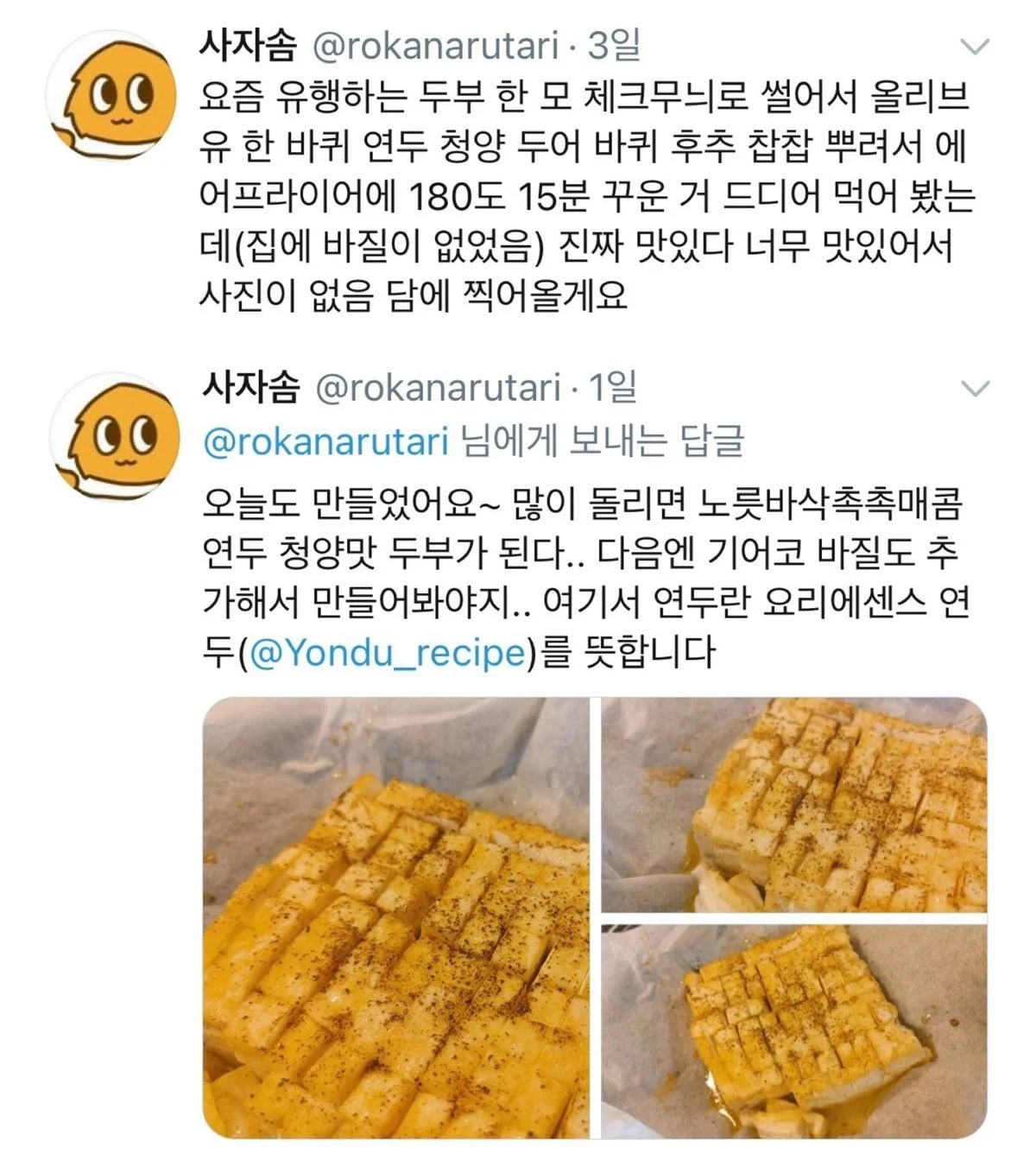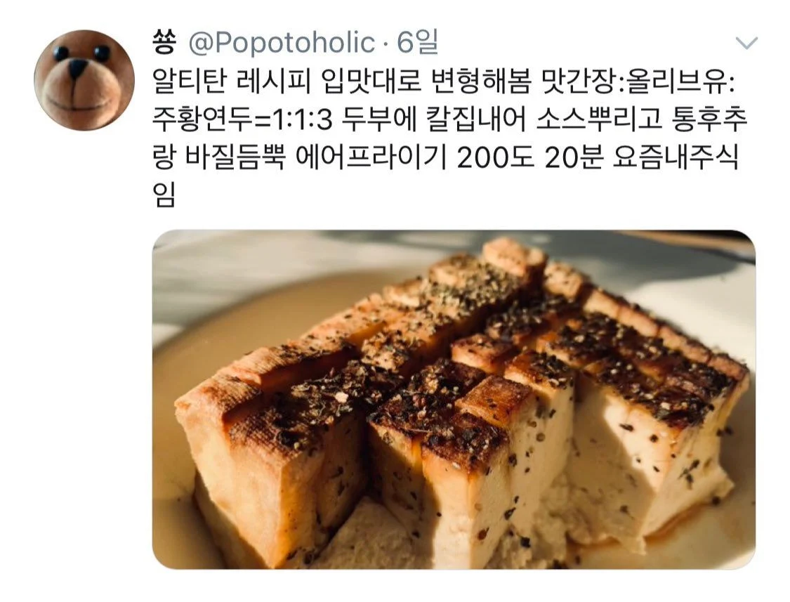 [음식]한때 트위터에서 유행했던 음식 '두부연두구이' 작성자과자|작성시간25.11.23|조회수4,579 목록 댓글 6 글자크기 작게가 글자크기 크게가 https://theqoo.net/square/4003067880 다음검색 현재 게시글 추가 기능 열기 북마크 공유하기 신고 센터로 신고 댓글 댓글 6 댓글쓰기 답글쓰기 댓글 리스트 삭제된 댓글입니다. 답댓글 작성자fresh_bizzy | 작성시간 25.11.23 아 임티 개웃기네 작성자냐세요세여 | 작성시간 25.11.23 개맛잇음 작성자이름김연탄 | 작성시간 25.11.23 이거넘마싯어 작성자두잇 | 작성시간 25.11.23 마침 두부도 잇어 연두순으로 해볼게 댓글 전체보기
