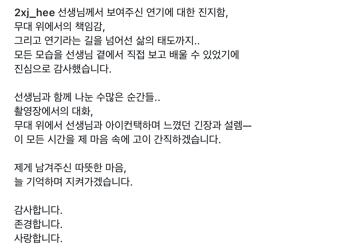 [기타]배우 진지희 인스타그램 (故 이순재 추모) 작성자롤로노아 조로|작성시간25.11.25|조회수10,622 목록 댓글 12 글자크기 작게가 글자크기 크게가 https://theqoo.net/square/40056555962009년 - 2010년 MBC <지붕뚫고 하이킥> 이후2022년 - 2023년 연극 <갈매기>로 또 함께 연기했었음 다음검색 현재 게시글 추가 기능 열기 북마크 공유하기 신고 센터로 신고 댓글 댓글 12 댓글쓰기 답글쓰기 댓글 리스트 작성자개구리 | 작성시간 25.11.25 아.... 작성자YUNA KIM | 작성시간 25.11.25 아마지막사진 너무 슬픈데 작성자중녀사랑단 | 작성시간 25.11.25 아 슬프다...ㅠ 작성자ChristianYu | 작성시간 25.11.26 아 아직도 안믿긴다 진짜 작성자우땨땨땨 | 작성시간 25.11.26 ㅜㅜㅜㅜㅜㅜ 댓글 전체보기