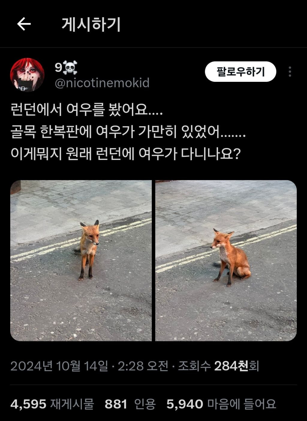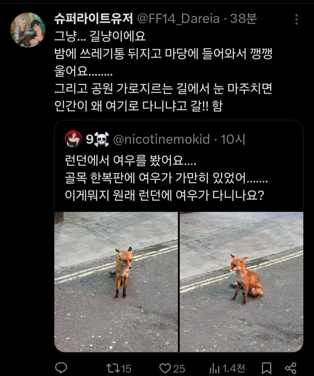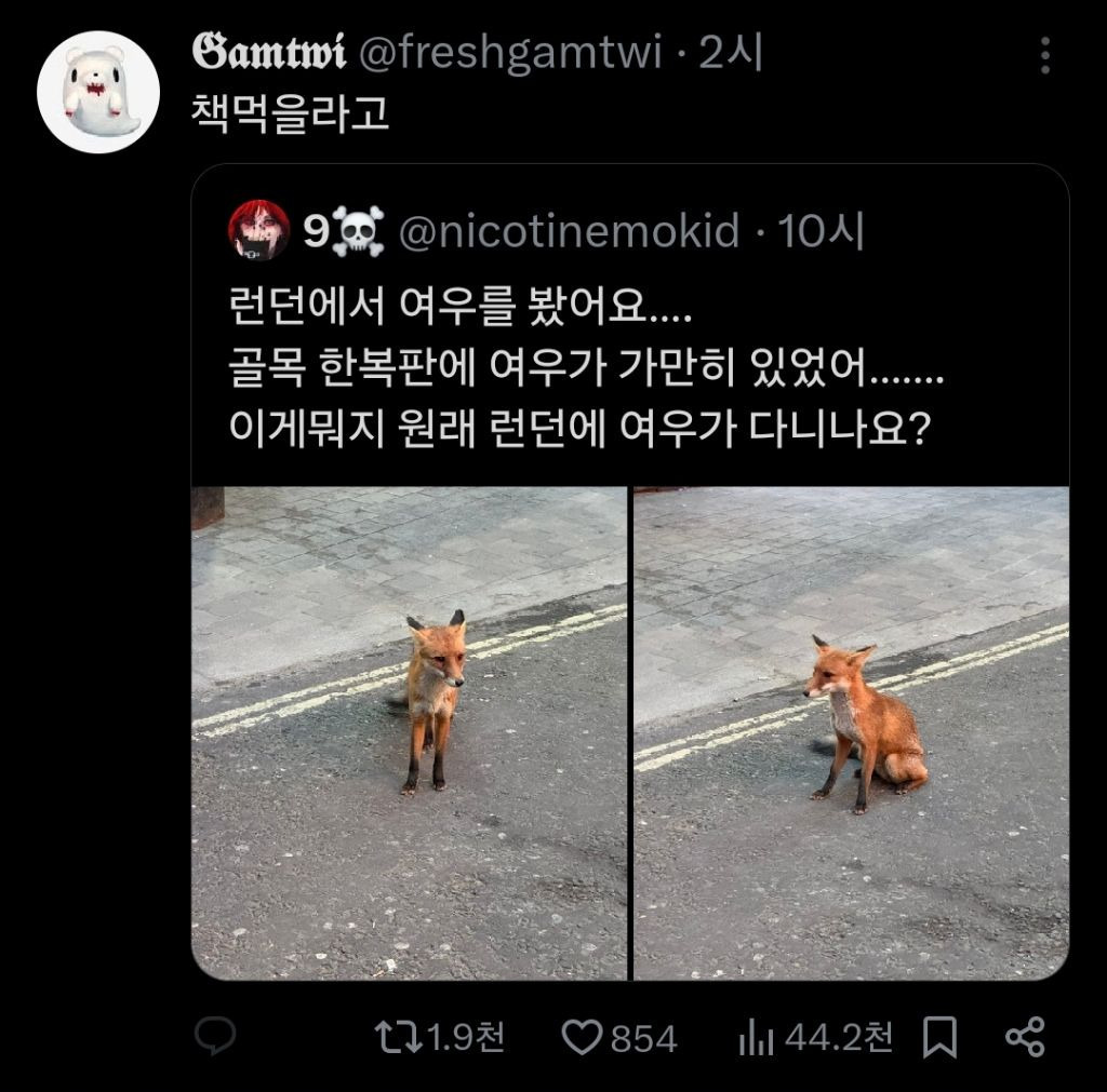 [스크랩] [기타]이게뭐지 원래 런던에 여우가 다니나요? 작성자과자|작성시간25.11.30|조회수3,712 목록 댓글 4 글자크기 작게가 글자크기 크게가 엽기 혹은 진실(세상 모든 즐거움이 모이는곳)출처 : https://theqoo.net/square/3442301328 다음검색 스크랩 원문 : 엽기 혹은 진실 (세상 모든 즐거움이 모이는 곳) 현재 게시글 추가 기능 열기 북마크 공유하기 신고 센터로 신고 댓글 댓글 4 댓글쓰기 답글쓰기 댓글 리스트 작성자원어스 이서호 | 작성시간 25.11.30 책먹을라고 작성자HAERIN | 작성시간 25.11.30 갈! 작성자dappled sunlight | 작성시간 25.11.30 책먹을라고 작성자벽걸이달력 | 작성시간 25.11.30 귀엽다 댓글 전체보기