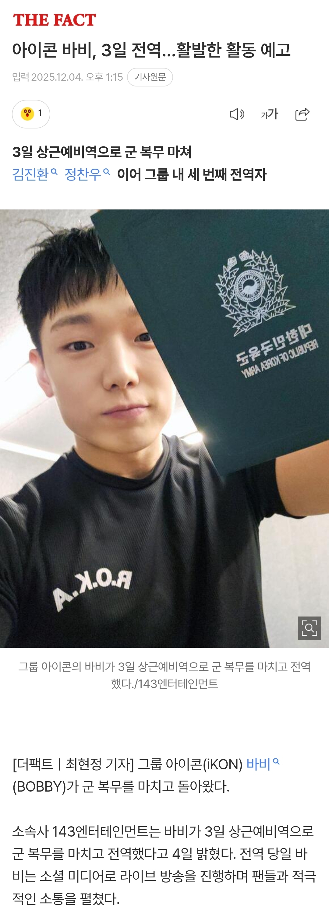 [뉴스]아이콘 바비, 3일 전역…활발한 활동 예고 작성자롤로노아 조로|작성시간25.12.04|조회수2,044 목록 댓글 23 글자크기 작게가 글자크기 크게가 https://m.entertain.naver.com/now/article/629/0000450123아이콘 바비, 3일 전역…활발한 활동 예고여기를 눌러 링크를 확인하세요m.entertain.naver.com진수눈아 ㅊㅋㅊㅋ 다음검색 현재 게시글 추가 기능 열기 북마크 공유하기 신고 센터로 신고 댓글 댓글 23 댓글쓰기 답글쓰기 댓글 리스트 작성자양일우와 나 | 작성시간 25.12.04 진수눈아 작성자비엘조아 | 작성시간 25.12.04 진수눈아 작성자Soobin | 작성시간 25.12.04 진수눈아 작성자박준순 | 작성시간 25.12.04 진수눈아 작성자태구 | 작성시간 25.12.04 진수눈아 댓글 전체보기