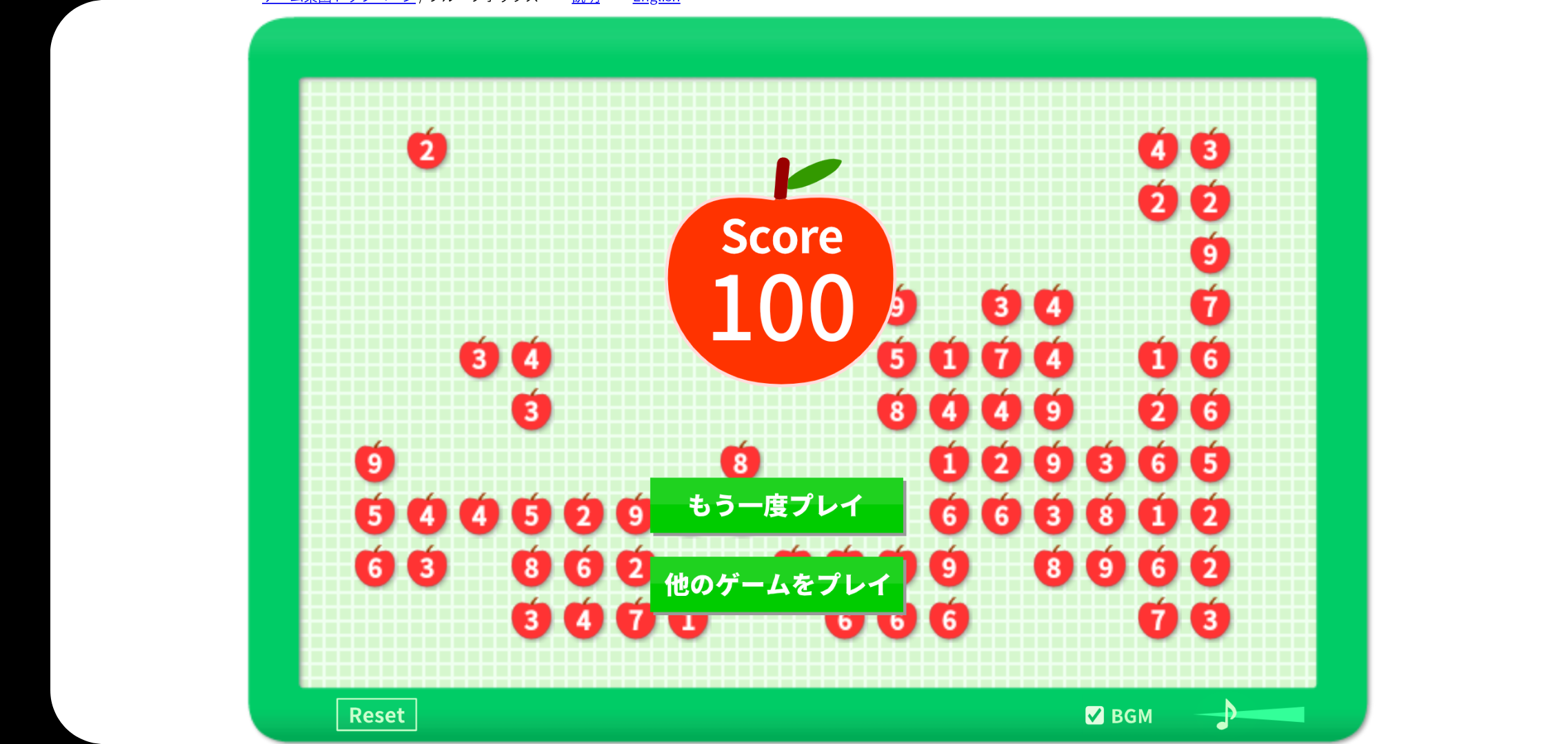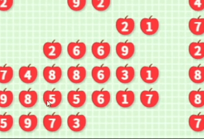 커서를 드래그해서 네모 안에 들어가는 사과 숫자 합이 10이 되면 사라짐
