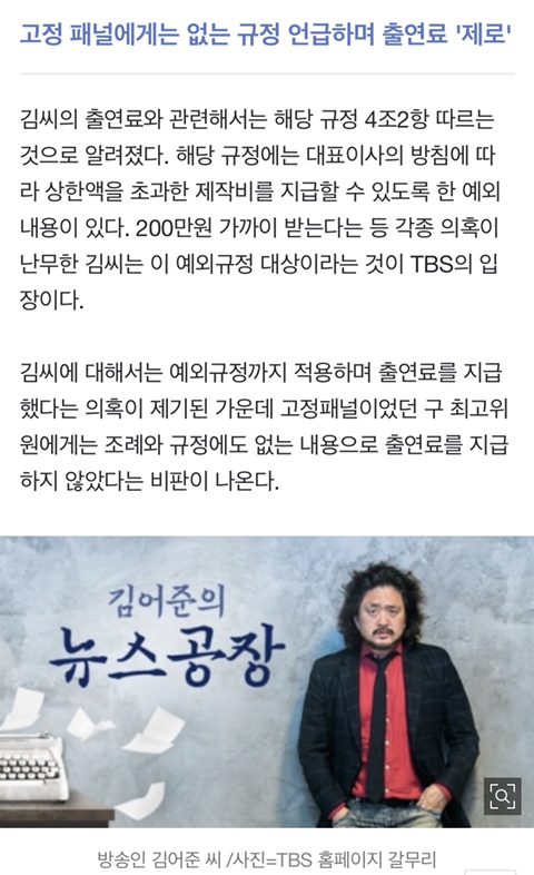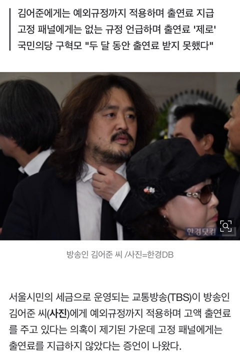 [뉴스][단독] 김어준 '고액 출연료' 논란 TBS, 고정 패널에겐 0원 작성자이승현|작성시간21.04.19|조회수240 목록 댓글 1 글자크기 작게가 글자크기 크게가 https://n.news.naver.com/article/015/0004532133?cds=news_my[단독] 김어준 '고액 출연료' 논란 TBS, 고정 패널에겐 0원서울시민의 세금으로 운영되는 교통방송(TBS)이 방송인 김어준 씨( 사진 )에게 예외규정까지 적용하며 고액 출연료를 주고 있다는 의혹이 제기된 가운데 고정 패널에게는 출연료를 지급하지 않n.news.naver.com 다음검색 현재 게시글 추가 기능 열기 북마크 공유하기 신고 센터로 신고 댓글 댓글 1 댓글쓰기 답글쓰기 댓글 리스트 작성자엔시티 태일 | 작성시간 21.04.19 저 털보 아저씨는 왜 저러고 산다냐.. 댓글 전체보기