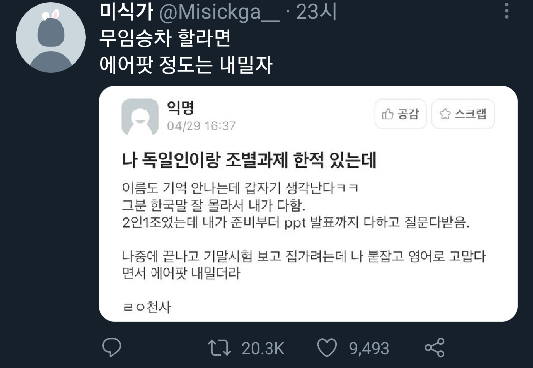 [유머]무임승차 할거면 에어팟 선물해라 .twt 작성자신밀살림업로더|작성시간21.05.01|조회수1,156 목록 댓글 13 글자크기 작게가 글자크기 크게가 ㅊㅊhttps://twitter.com/Misickga__/status/1388009413391228931?s=19 다음검색 현재 게시글 추가 기능 열기 북마크 공유하기 신고 센터로 신고 댓글 댓글 13 댓글쓰기 답글쓰기 댓글 리스트 작성자찡긋 | 작성시간 21.05.01 또 맡겨주세요 작성자김사장 | 작성시간 21.05.01 미쳣다 작성자냥바바 | 작성시간 21.05.01 오오..(o.o)b 작성자시엘 | 작성시간 21.05.01 와... 작성자기린그림 | 작성시간 21.05.02 저정도면 인정 댓글 전체보기