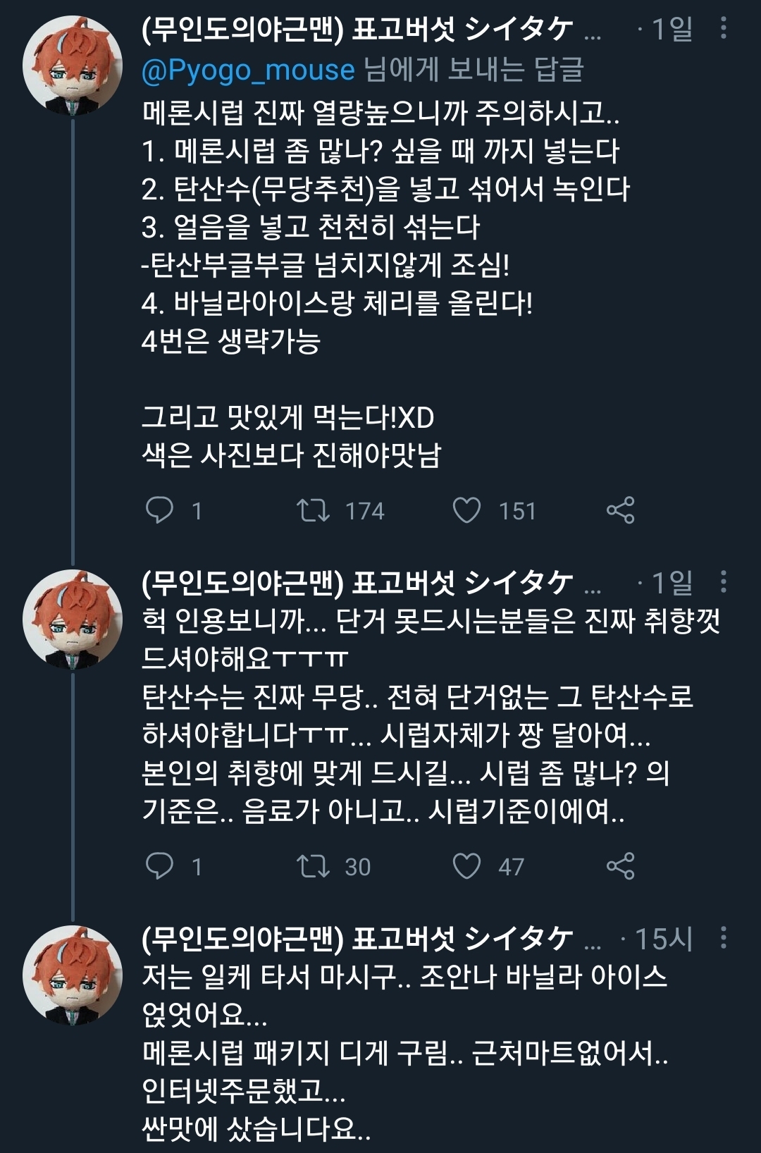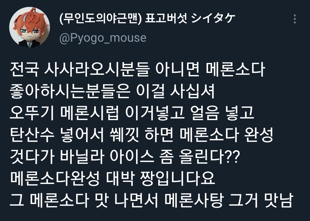[기타]메론소다 만드는 법 (feat. 디자인 개구린 오뚜기) 작성자신밀살림업로더|작성시간21.05.09|조회수1,296 목록 댓글 10 글자크기 작게가 글자크기 크게가 밀리토리네 신밀살림업로더ㅊㅊhttps://twitter.com/Pyogo_mouse/status/1390568871141134339?s=19ㅊㅊhttps://twitter.com/Dr_buses_/status/1390716855698870276?s=19 다음검색 현재 게시글 추가 기능 열기 북마크 공유하기 신고 센터로 신고 댓글 댓글 10 댓글쓰기 답글쓰기 댓글 리스트 작성자우정리노트 | 작성시간 21.05.09 파파야? 와 생각만 해도 맛있는데? 작성자마정석 | 작성시간 21.05.09 생긴게 먹으면 죽을 것 같은데.. 작성자그렇게됐다 | 작성시간 21.05.09 헐 사고싶어 작성자웅웅알겠어요왕자님 | 작성시간 21.05.09 오ㅓ 작성자호피 | 작성시간 21.05.09 난 저거 별로였음..ㅜ 맛이 내가 아는 그 느낌이 아님.. 댓글 전체보기