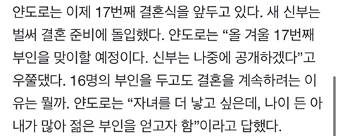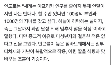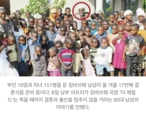 [뉴스]부인 16명과 자녀 151명 낳은 60대 남성, 17번째 결혼 준비중 작성자이승현|작성시간21.05.12|조회수607 목록 댓글 3 글자크기 작게가 글자크기 크게가 https://n.news.naver.com/article/081/0003185762?cds=news_my부인 16명과 자녀 151명 낳은 60대 남성, 17번째 결혼 준비중[서울신문 나우뉴스] 부인 16명과 자녀 151명을 둔 짐바브웨 남성이 17번째 결혼식을 준비 중이다. 6일 남부 아프리카 짐바브웨 국영 ‘더 헤럴드’는 죽을 때까지 결혼과 출산을 멈추지 않을 거라n.news.naver.com인터뷰 읽어봐 말하는 거 하나하나 다 주옥같음..ㅋ 다음검색 현재 게시글 추가 기능 열기 북마크 공유하기 신고 센터로 신고 댓글 댓글 3 댓글쓰기 답글쓰기 댓글 리스트 작성자블로섬 | 작성시간 21.05.12 미친ㅁ 작성자리미2 | 작성시간 21.05.12 아역겨워 제발 죽어 작성자에픽하이 | 작성시간 21.05.13 에바다 진짜... 댓글 전체보기