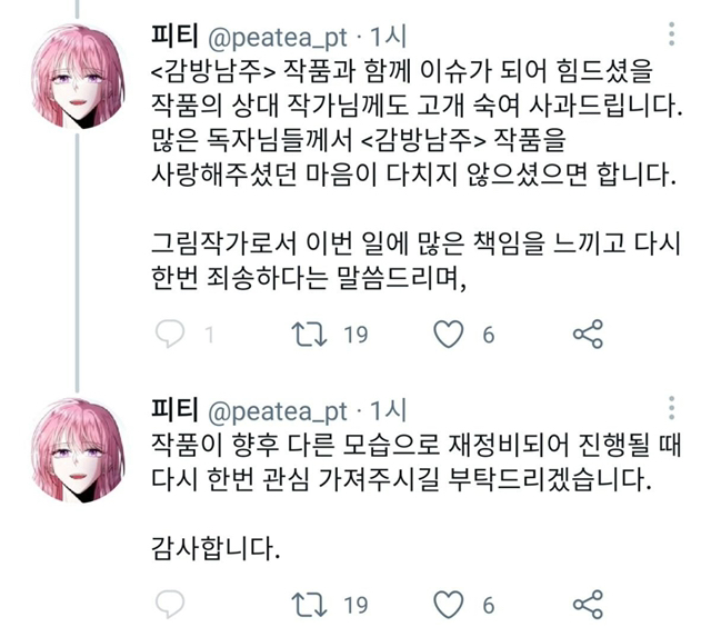 논란 후 소설 원작 작가님과 웹툰 그림 작가님 입장문이 올라오고 웹툰은 21화로 우선 마무리 됨