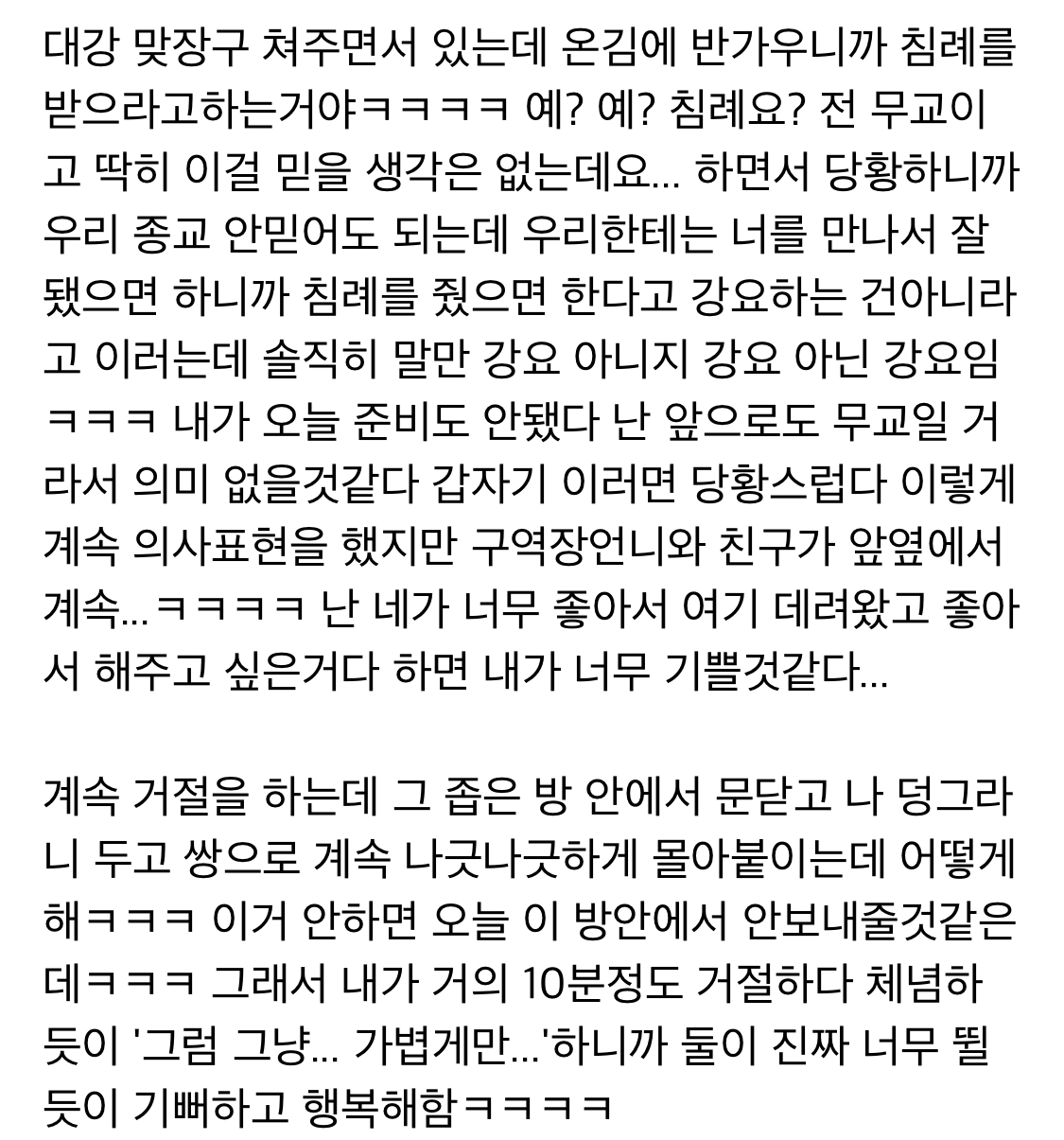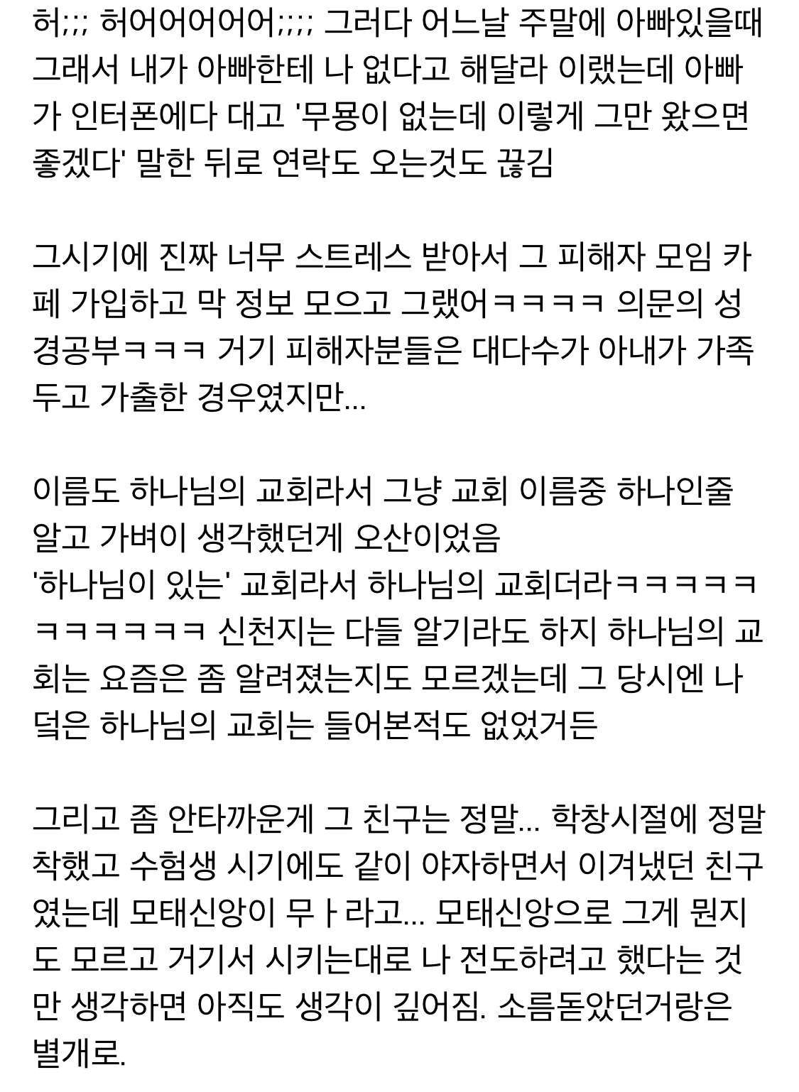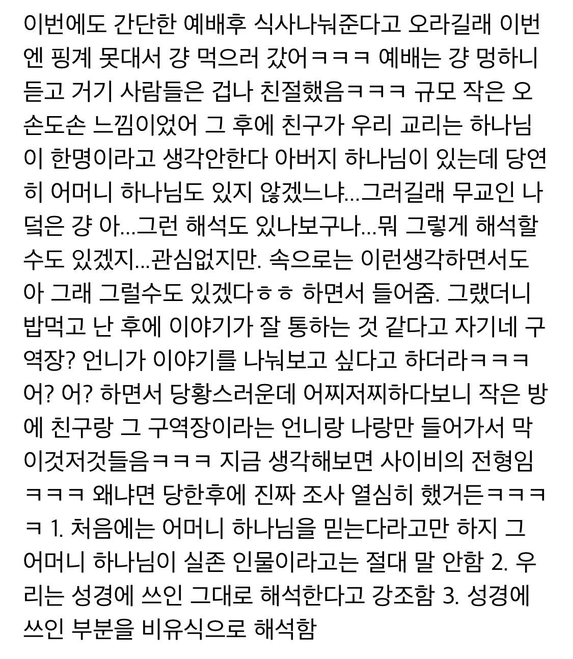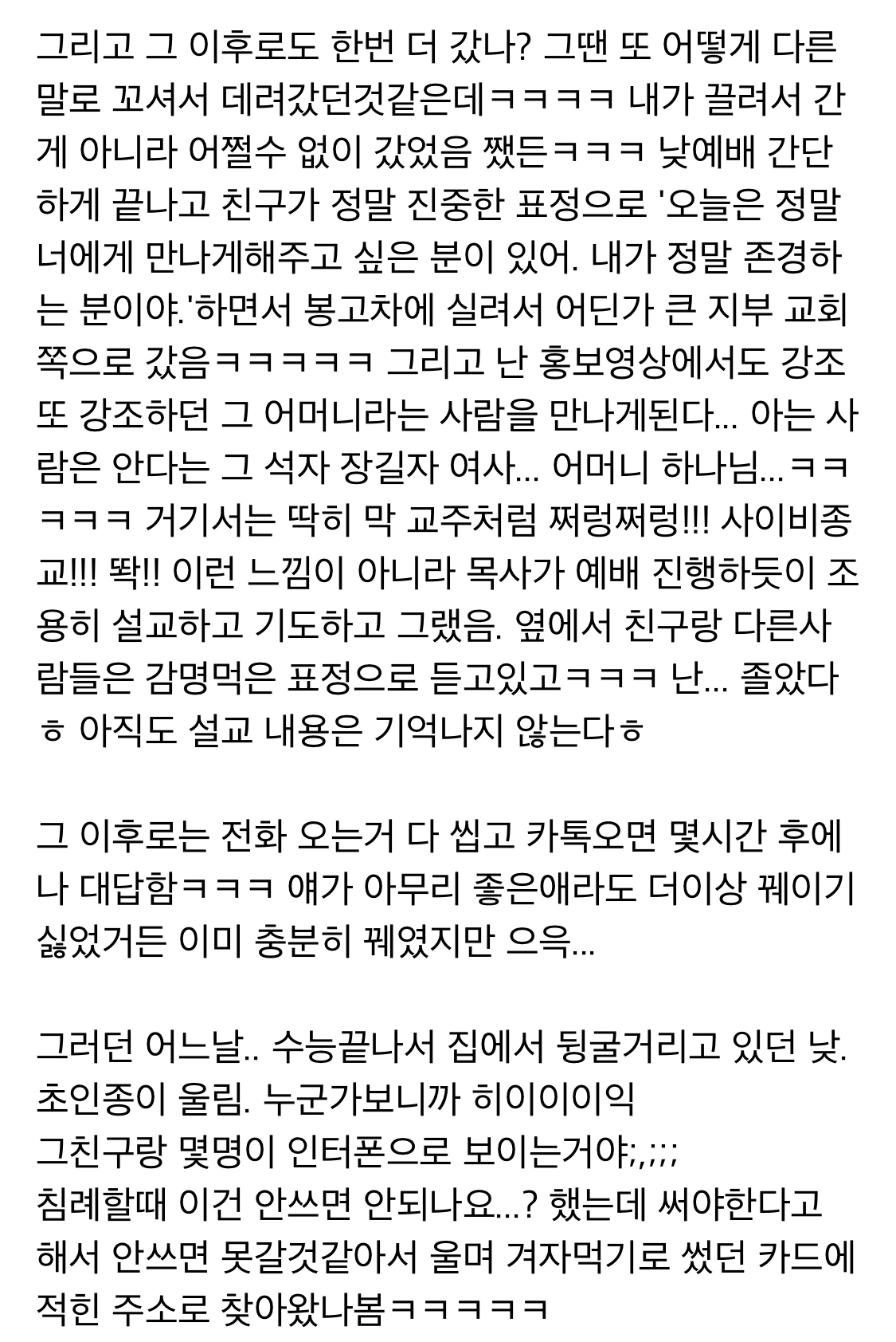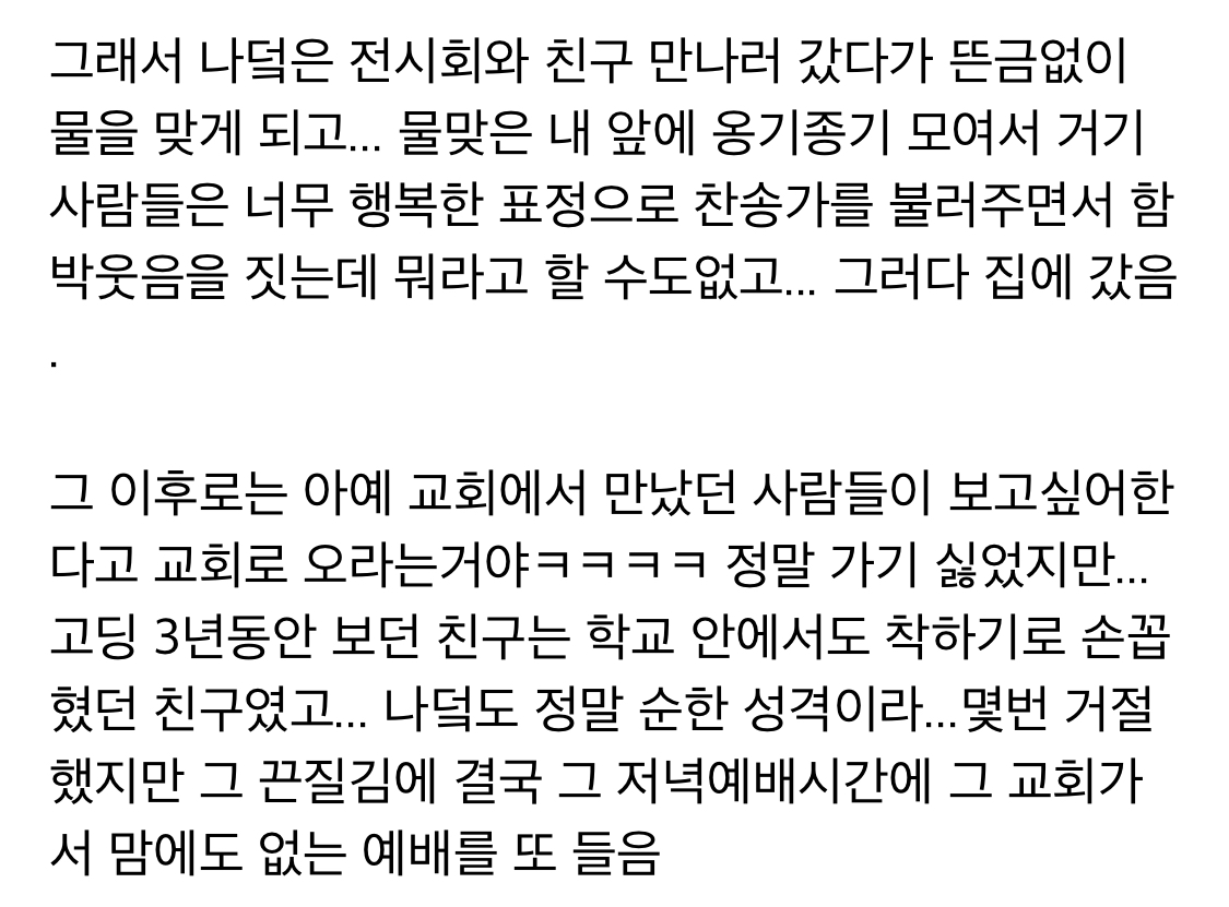 작성자눈을감자 작성시간 21.10.20 와 나도 중딩때 친구가 데려가서 침례인가 뭐 받으라고 해서 도망쳐나왔어.... 그때 진짜 무서웠는데