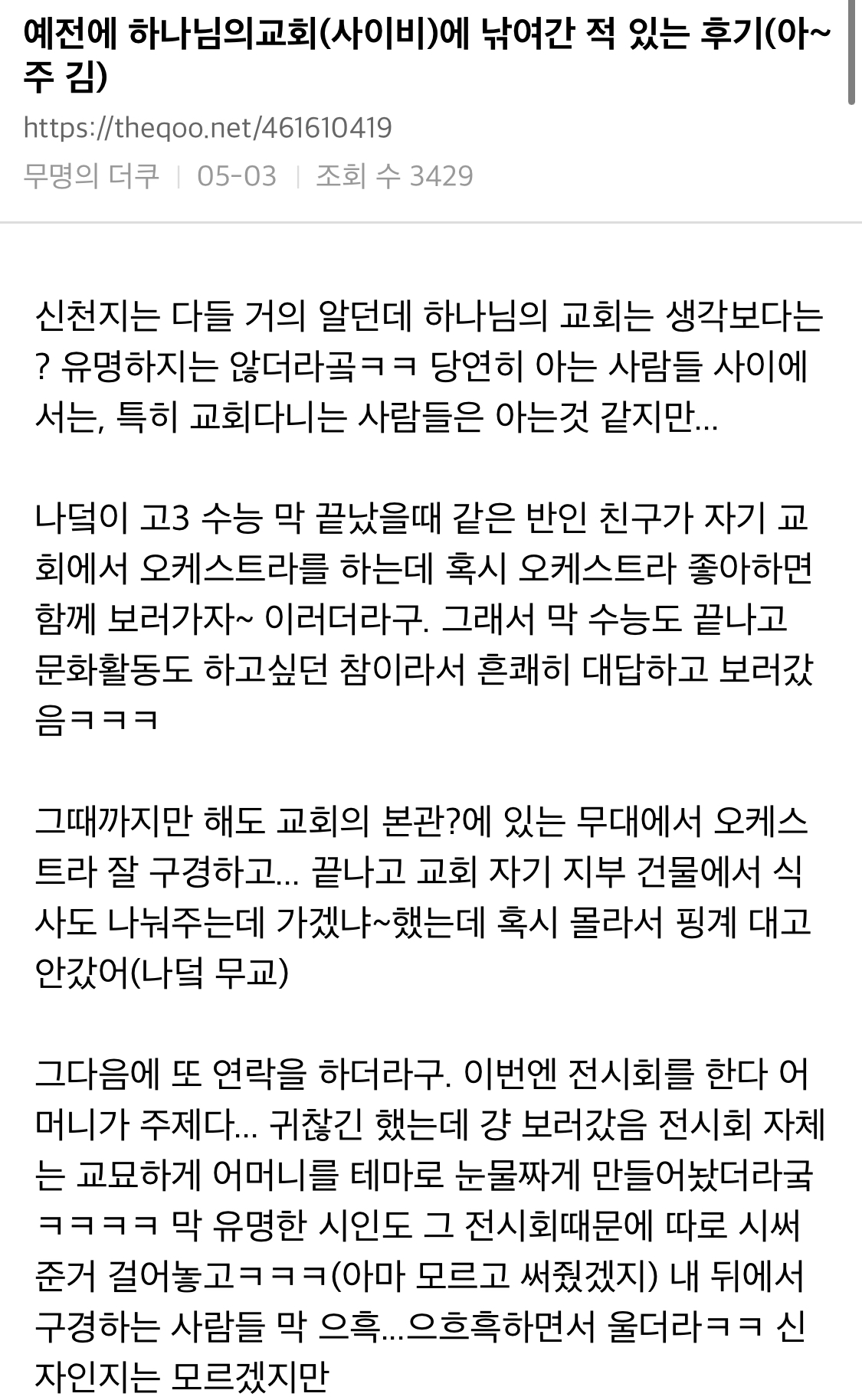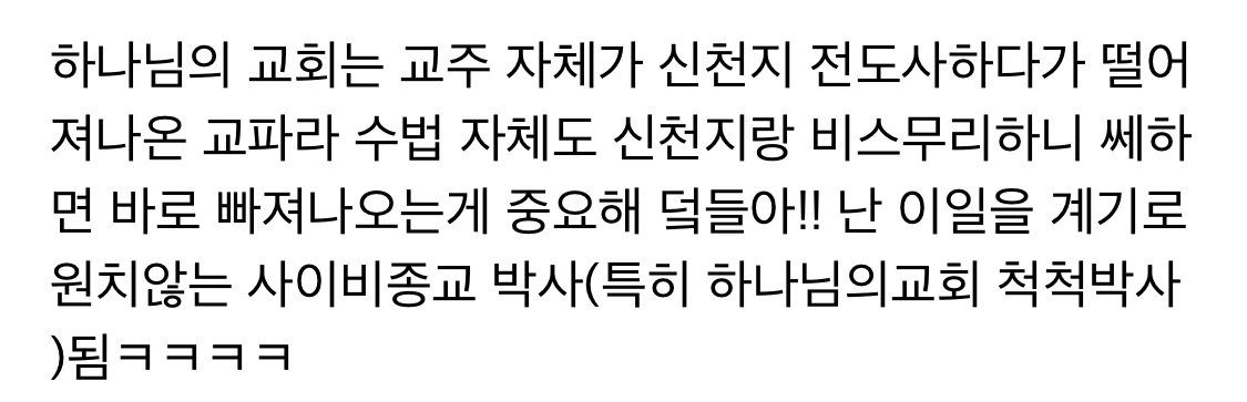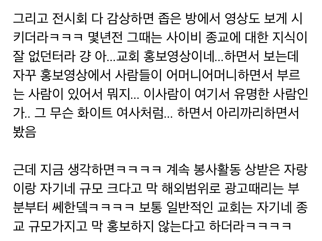 작성자윤 태희 작성시간 21.10.20 나 내 친구가 하나님의 교회 다녀서 몇 번 같이 갔었는데 ㅋㅋㅋㅋㅋㅋ 근데 나 저기서 세례? 물 맞는 거 그것도 받고... 걍 그러다가 재미없어서 안 갔어... 지금에서야 위험하니까 안 빠져서 다행이다 하는데 당시에는 그닥 나를 교회에 계속 다니게 하려는 수작? 도 없었고 그냥 다들 착했고... 만약 내가 빠진다면 ㅋㅋ 꺼내줄 사람도 있었고 여튼 걍 암 생각 없이 다녔었어 근데 저긴 사이비가 아니라 이단 아냐? 여튼... 규모는 진짜 큼 아 그리고 보통 교회는 일요일날 가잖아? 저기는 토요일임! 만약 토욜날 교회 간다고 하믄 의심해바~
