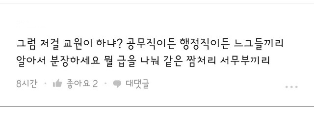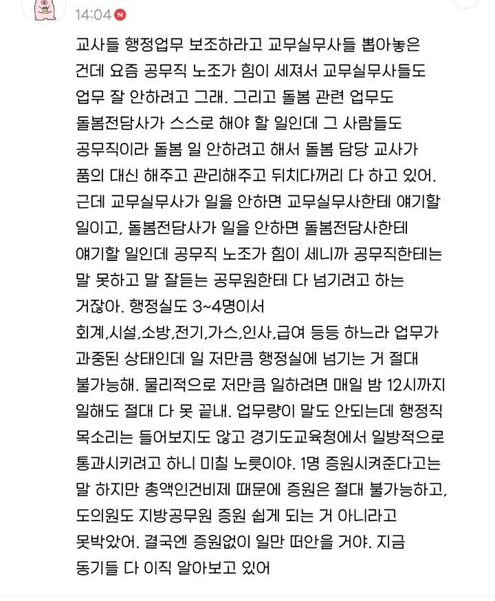 그리고 개인적인 의견인데 이 과정으로 혜택을 보는건 분명히 교사들이고, 행정실이 부당한 업무를 떠맡는다는 것을 알면서도 목소리를 내지 않고 있거나 “나도 바빠(분명 본인이 해야하는 업무)”를 시전하여 더 욕먹는 것도 있다고 봄…