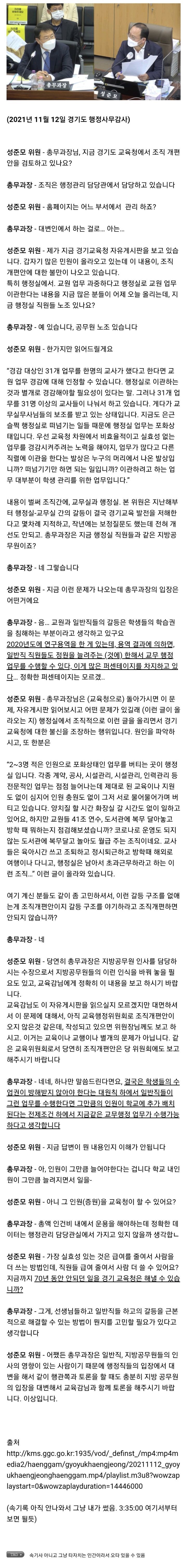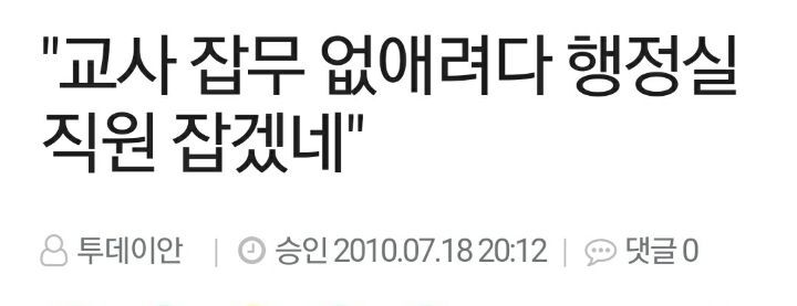 경기도 교육청, 전교조, 일반 교사 노조에서 행정실 인원 1명을 충원해주는 대신, 31개의 업무를 행정실 (교육행정직 공무원)들에게 넘긴다고 해서 난리가 남