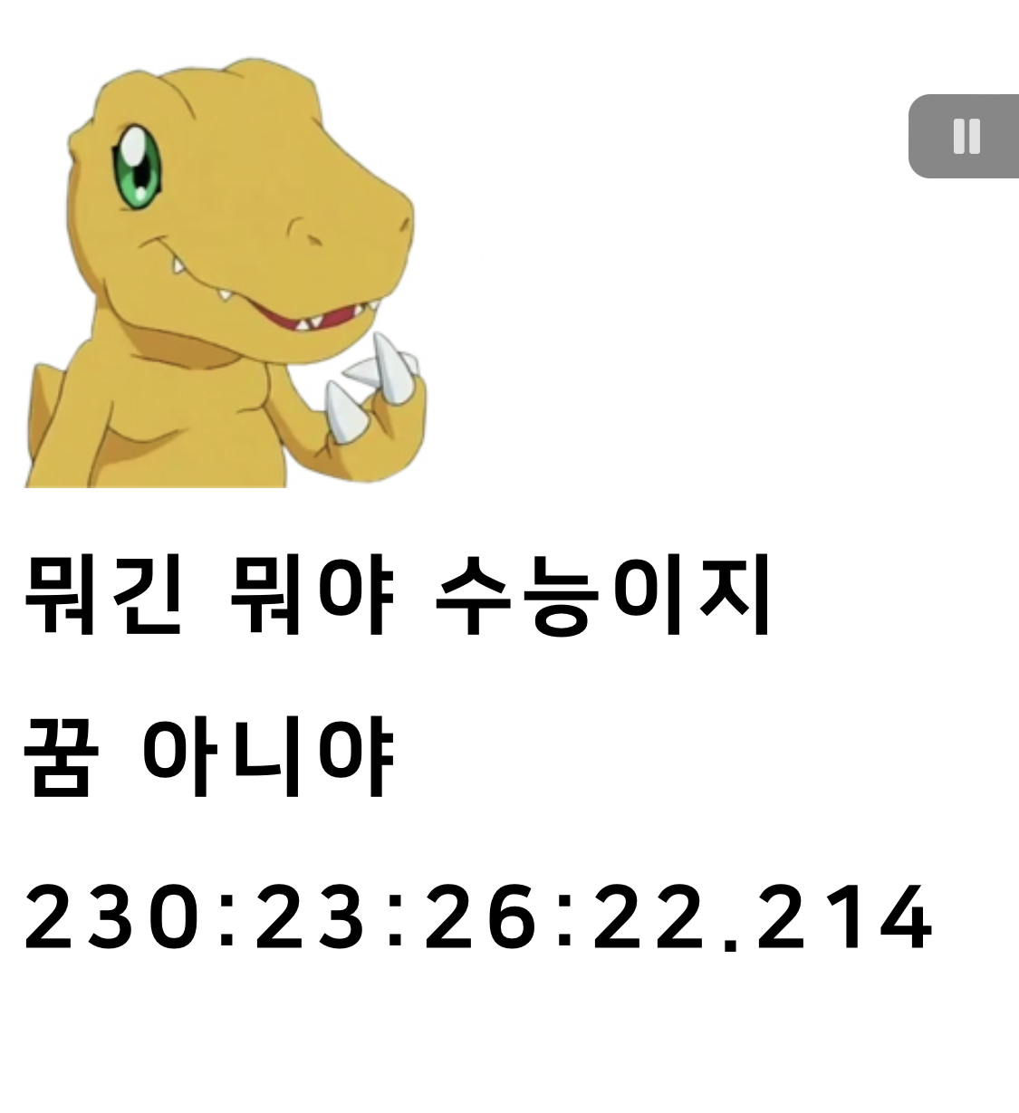 [기타]그 시절 아구몬 수능시계 작성자아니|작성시간22.03.31|조회수1,399 목록 댓글 11 글자크기 작게가 글자크기 크게가 다음카페 밀리토리네 [신문보는 밀리]그 시절 수능 디데이를 책임졌던 swf 감성...https://chanwookim.me/agumon-dday/아구몬 수능시계여기를 눌러 링크를 확인하세요chanwookim.me예전에 없어졌었다가 다시 부활함그 시절 브금도 재생 가능ㅋㅋㅋㅋ 다음검색 현재 게시글 추가 기능 열기 북마크 공유하기 신고 센터로 신고 댓글 댓글 11 댓글쓰기 답글쓰기 댓글 리스트 작성자뵤영 | 작성시간 22.03.31 이거 17학번인가 16학번 애들이 마지막이랫엇는데 또 나왓군아 작성자Naevis | 작성시간 22.03.31 설레이는 이 마음은 뭘~까 작성자베리베리젤라또 와플 | 작성시간 22.03.31 설레이는 이 마음은 뭘까 작성자직선제 지켜 | 작성시간 22.03.31 안녕 디~지몬 작성자박쥐를 | 작성시간 22.03.31 개추억 ㅋㅋㅋㅋ내 수능 아닐 때 보던 거랑 내 수능일 때 보던 건 너무 달랐지 ㅎ.. 댓글 전체보기