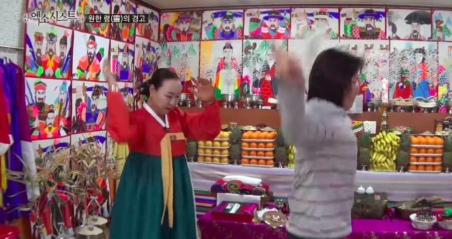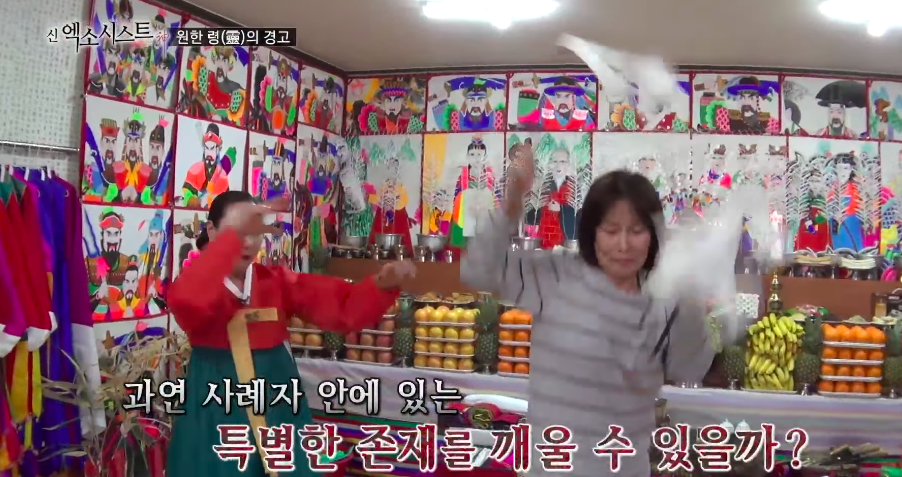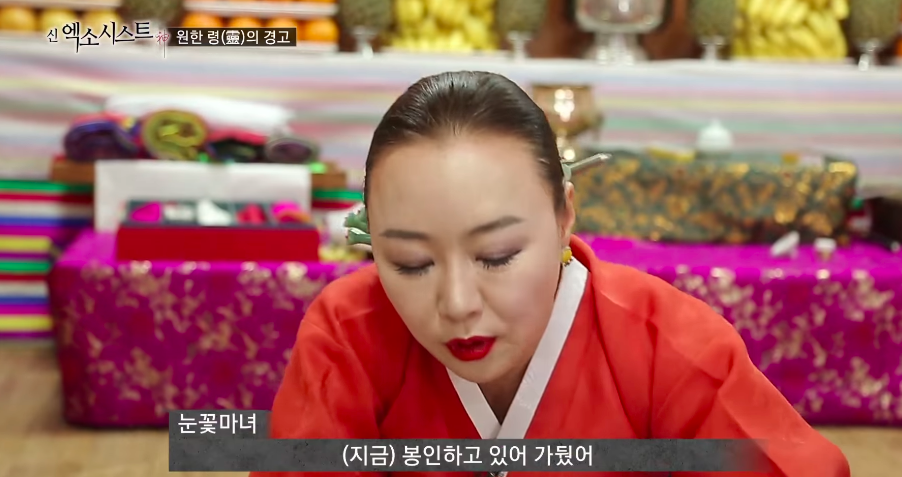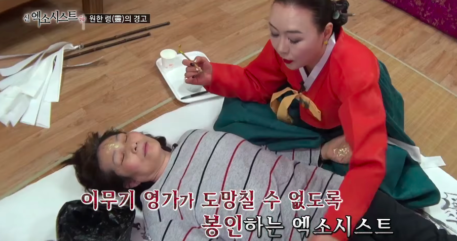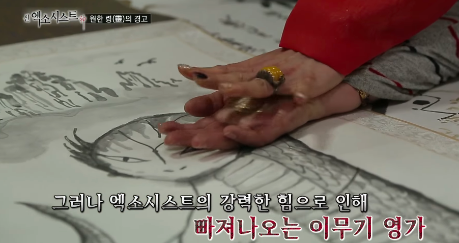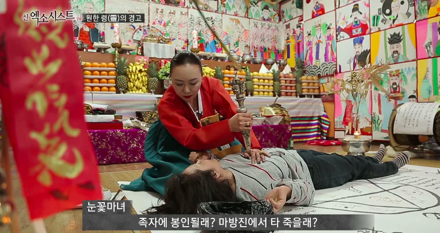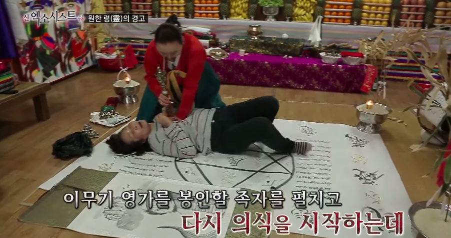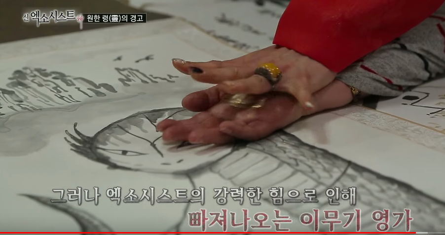 이무기가 족자에서 빠져나오지 않게 신께 다시 기도드리시는 중