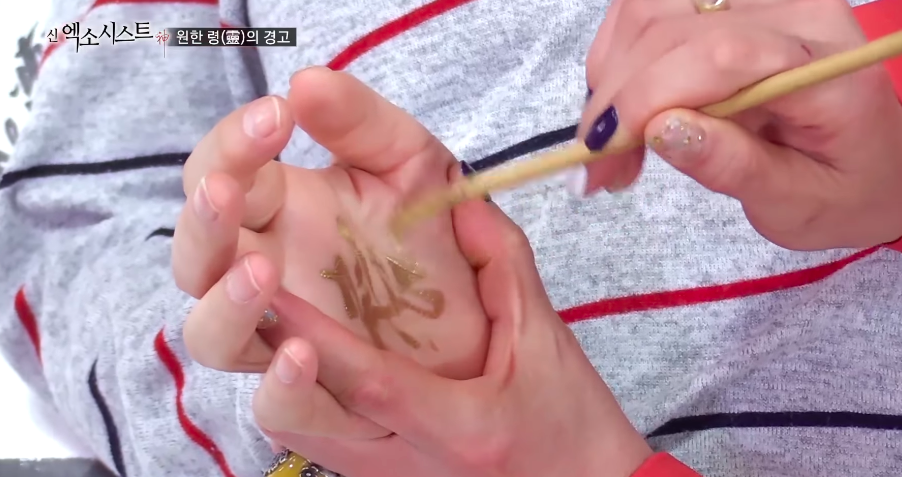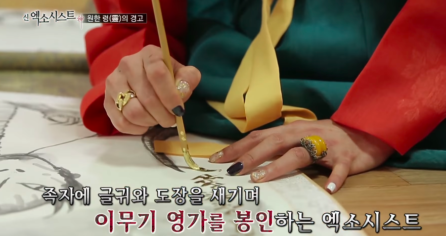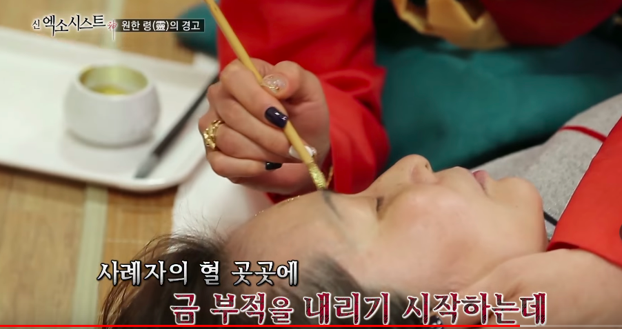 금으로 된 붓과 먹으로 이마에 글자를 쓰시는 중