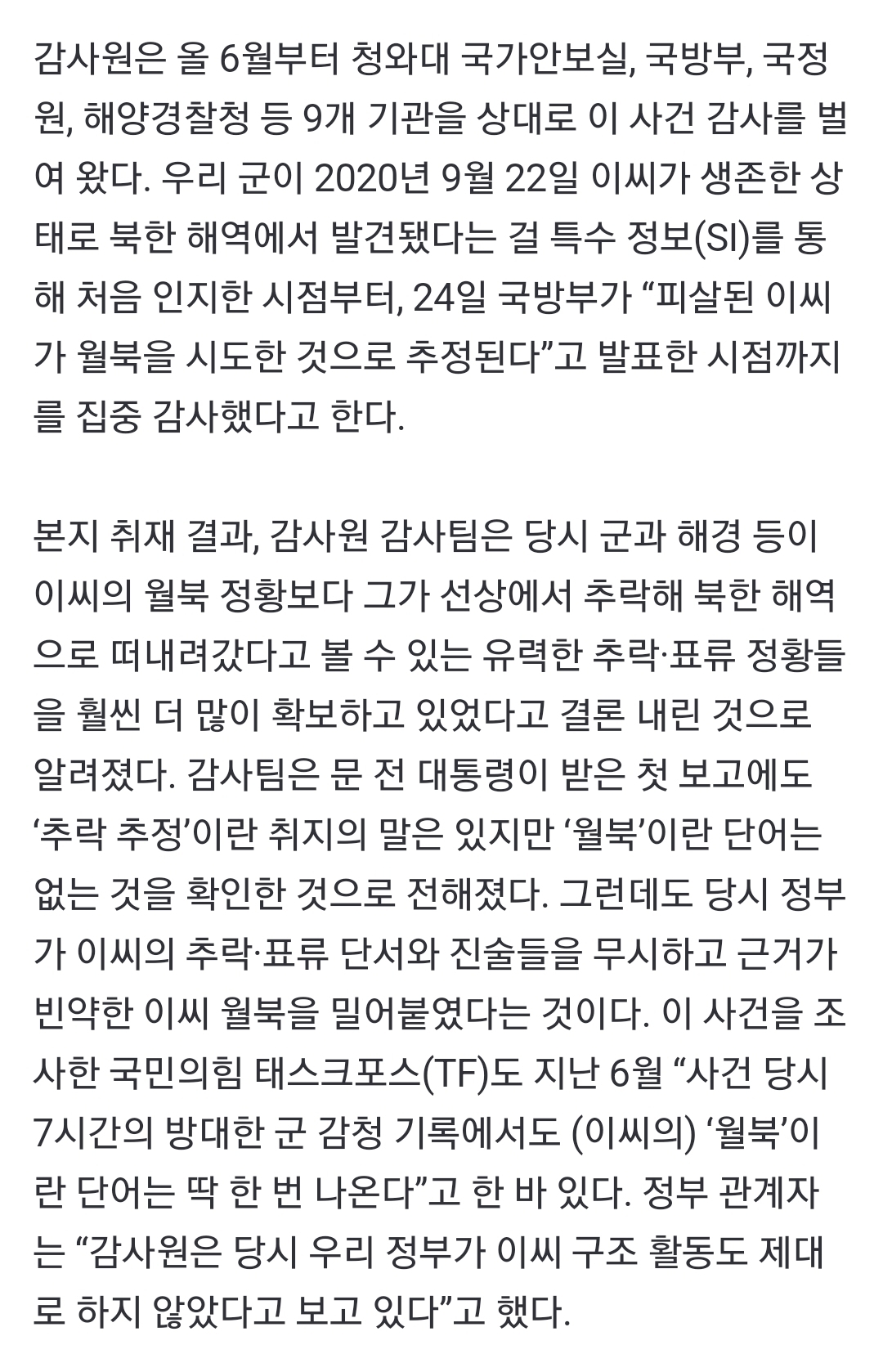 [뉴스][단독] “文 정부, 서해 공무원 월북몰이 했다”...감사원 결론 🚨 작성자비타밍|작성시간22.10.13|조회수495 목록 댓글 21 글자크기 작게가 글자크기 크게가 https://n.news.naver.com/mnews/article/023/0003721653[단독] “文 정부, 서해 공무원 월북몰이 했다”...감사원 결론감사원이 2020년 해양수산부 공무원 이대준씨 피살 사건과 관련, 당시 문재인 정부가 이씨의 추락·표류 정황을 다수 확인했음에도 이씨의 월북이 추정된다고 발표하는 등 사실상의 ‘월북 몰이n.news.naver.com댓 따봉 제발 부탁해 다음검색 현재 게시글 추가 기능 열기 북마크 공유하기 신고 센터로 신고 댓글 댓글 21 댓글쓰기 답글쓰기 댓글 리스트 작성자wiwh | 작성시간 22.10.13 ㅇㄹ 작성자호롭 | 작성시간 22.10.13 ㅇㄹ 작성자이재덍 | 작성시간 22.10.13 ㅇㄹ 작성자버번지기 | 작성시간 22.10.13 ㅇㄹ 작성자아기민들레 | 작성시간 22.10.14 ㅇㄹ 댓글 전체보기