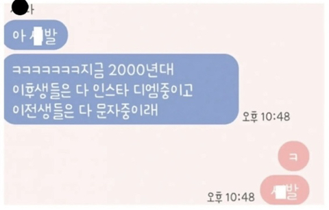 [고르기/질문글]이번 카톡사태에서 세대차이 느껴지는 부분.jpg 작성자ipad|작성시간22.10.21|조회수1,758 목록 댓글 52 글자크기 작게가 글자크기 크게가 나는1 문자를 했다2 dm을 했다 다음검색 현재 게시글 추가 기능 열기 북마크 공유하기 신고 센터로 신고 댓글 댓글 52 댓글쓰기 답글쓰기 댓글 리스트 작성자문프 | 작성시간 22.10.21 99 디엠이요.. 작성자츄베릅념념굿 | 작성시간 22.10.21 01 문자함ㅋㅋ 작성자그럴만두 | 작성시간 22.10.21 둘다햇잔아 작성자재앙 | 작성시간 22.10.21 96 문자함ㄷ ㄷ 작성자KINO | 작성시간 22.10.21 문자함 ㄷㄷ...ㅋㅋㅋㅋㅋㅋㅋㅋ 댓글 전체보기
