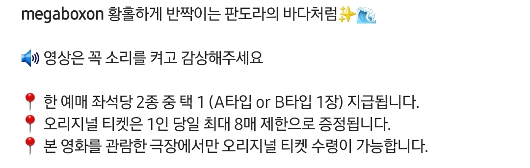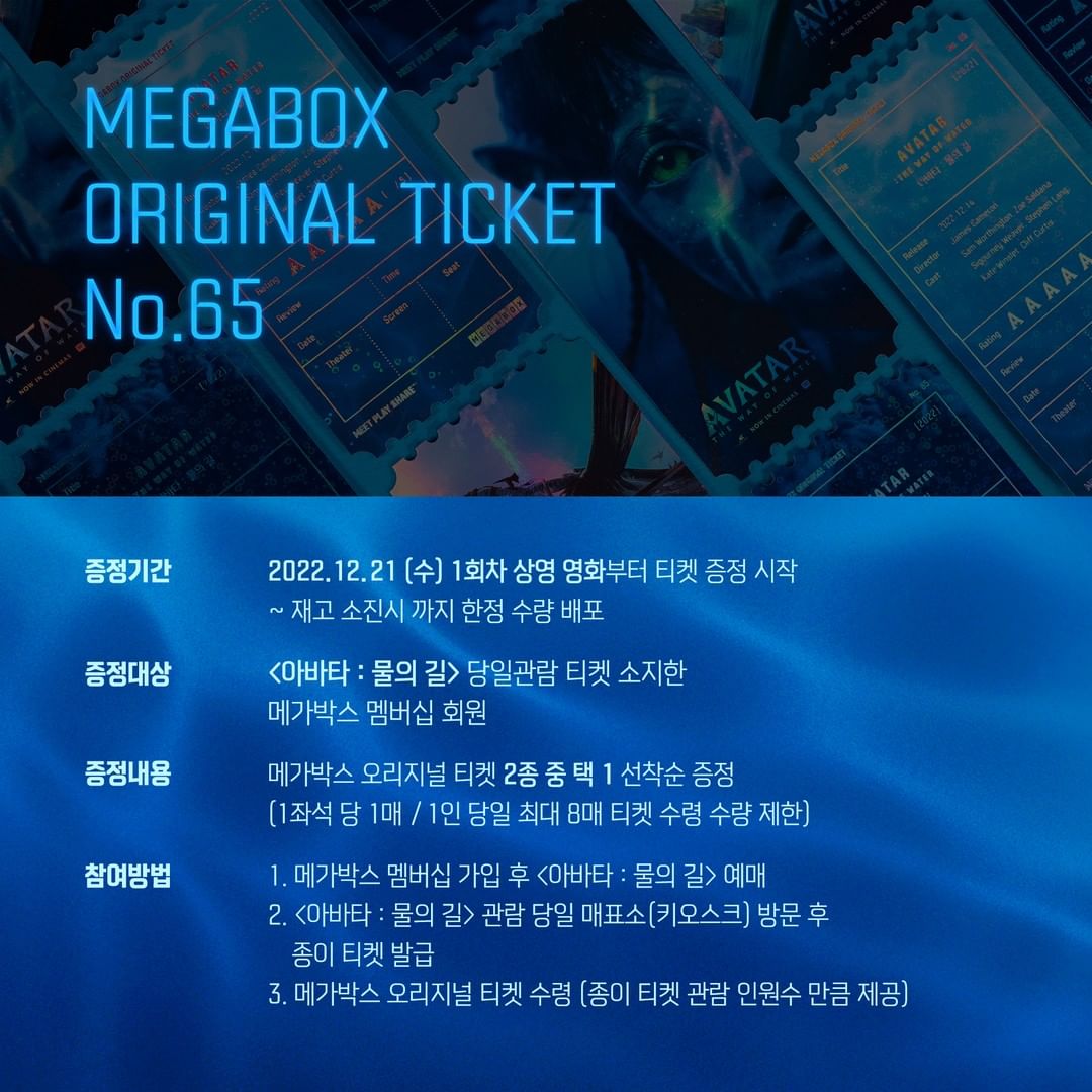 [영화]메가박스 오리지널 티켓 No.65<아바타 : 물의 길> 작성자김성철|작성시간22.12.20|조회수964 목록 댓글 9 글자크기 작게가 글자크기 크게가 https://www.instagram.com/p/CmYdzBqukVk/?igshid=YmMyMTA2M2Y=Instagram의 메가박스 MEGABOX님 : "황홀하게 반짝이는 판도라의 바다처럼✨🌊 🔊 영상은 꼭 소리메가박스 MEGABOX님이 Instagram에 게시물을 공유했습니다:"황홀하게 반짝이는 판도라의 바다처럼✨🌊 🔊 영상은 꼭 소리를 켜고 감상해주세요 📍 한 예매 좌석당 2종 중 택 1 (A타입 or B타입 1장) www.instagram.com 다음검색 현재 게시글 추가 기능 열기 북마크 공유하기 신고 센터로 신고 댓글 댓글 9 댓글쓰기 답글쓰기 댓글 리스트 작성자세상에완내스 | 작성시간 22.12.20 메가박스 열일해 아주 작성자화산 | 작성시간 22.12.20 와 너무 이쁘다.. 일욜에 봣는데.. 🥲 작성자탕수육 | 작성시간 22.12.20 메박 주말 거 미리 예약하고수요일에 받으러 가도 되나…? 답댓글 작성자탕수육 | 작성시간 22.12.20 뚜오ㅓ이씨 작성자COYS | 작성시간 22.12.20 개이뿌덩 댓글 전체보기