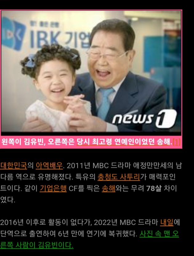[기타]아역배우 김유빈 근황 작성자순수한우|작성시간23.01.23|조회수3,341 목록 댓글 11 글자크기 작게가 글자크기 크게가 김유빈 올해 19세라고함맨오른쪽이 김유빈이라고 다음검색 현재 게시글 추가 기능 열기 북마크 공유하기 신고 센터로 신고 댓글 댓글 11 댓글쓰기 답글쓰기 댓글 리스트 작성자새해복만이받으쇼 | 작성시간 23.01.23 와 벌써 열어홉됐구나 작성자정쏨 | 작성시간 23.01.23 할 언제 이렇게 컸어 앵두 아녀?!!! 답댓글 작성자순수한우 작성자 본인 여부 작성자 | 작성시간 23.01.23 녹두전 앵두?그앤 아님 앵두는 아직 어려 답댓글 작성자정쏨 | 작성시간 23.01.23 아 앵두랑 비슷하게 생겼잔아 어쩐지 너무 컸드라 작성자햄쥑쥑이 | 작성시간 23.01.23 헐!!!!!!!!! 댓글 전체보기