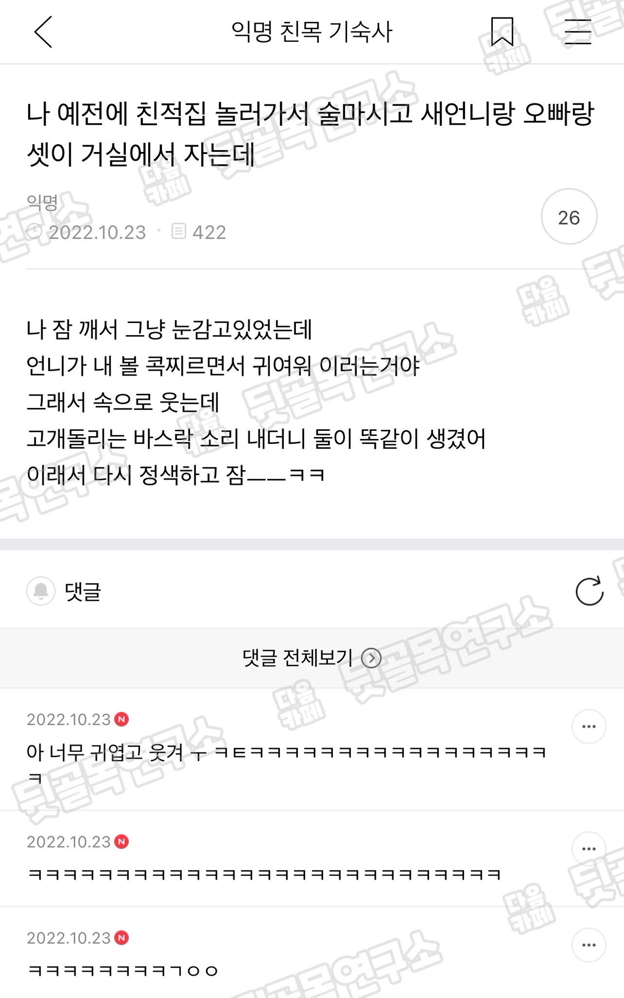 [유머]나 예전에 친적 집 놀러 가서 술 마시고 새언니랑 오빠랑 셋이 거실에서 자는데 작성자연콩킹|작성시간23.05.08|조회수3,187 목록 댓글 26 글자크기 작게가 글자크기 크게가 ㅊㅊ https://twitter.com/backalley_lab/status/1584471141086687232?s=46&t=RX5_u1MSNCf7aZaKrn8k3g트위터에서 즐기는 뒷골목 연구소“나 예전에 친적 집 놀러 가서 술 마시고 새언니랑 오빠랑 셋이 거실에서 자는데”twitter.com 다음검색 현재 게시글 추가 기능 열기 북마크 공유하기 신고 센터로 신고 댓글 댓글 26 댓글쓰기 답글쓰기 댓글 리스트 작성자콙치즈 | 작성시간 23.05.09 아ㅋㅋㅋㅋㅋㅋㅋㅋㅋㅋㅋㅋㅋㅋㅋㅋㅋㅋ귀여워ㅠㅠ 작성자아트 | 작성시간 23.05.09 아 ㅈㄴ 귀여워 진짜 ㅋㅋㅋㅋㅋㅋㅋ 작성자화이티이ㅣ이 | 작성시간 23.05.09 ㅋㅋㅋㅋㅋㅋ 작성자통크 | 작성시간 23.05.10 ㄱㅇㅇㅇㅇ 작성자민들레 | 작성시간 23.05.10 아ㅠㅋㅋㅋㅋㅋㅋㅋㅋㅋㅋㅋㅋ 댓글 전체보기