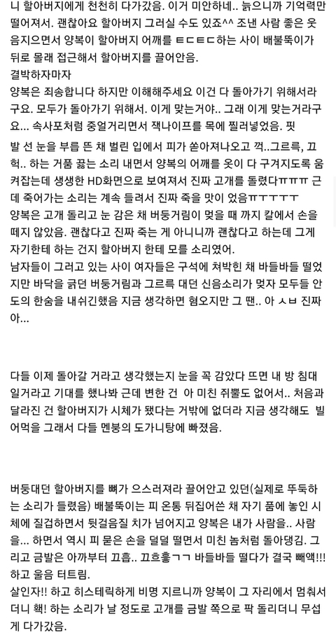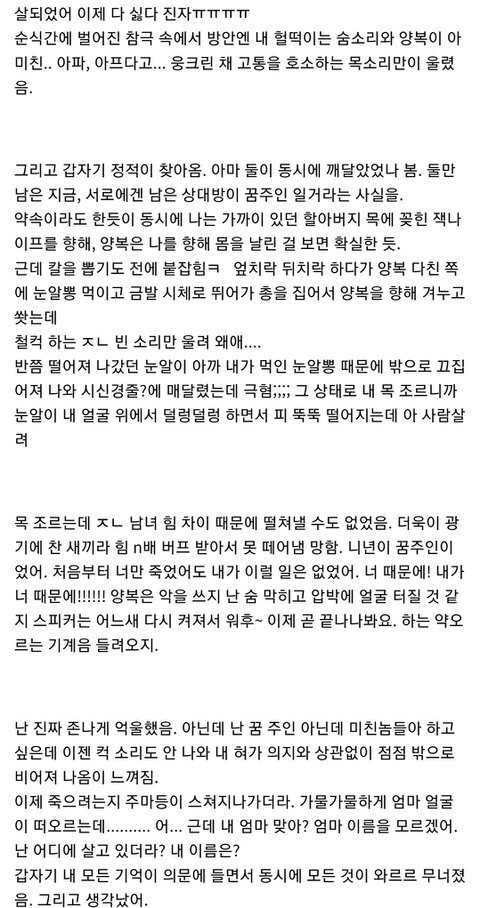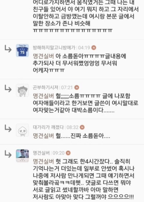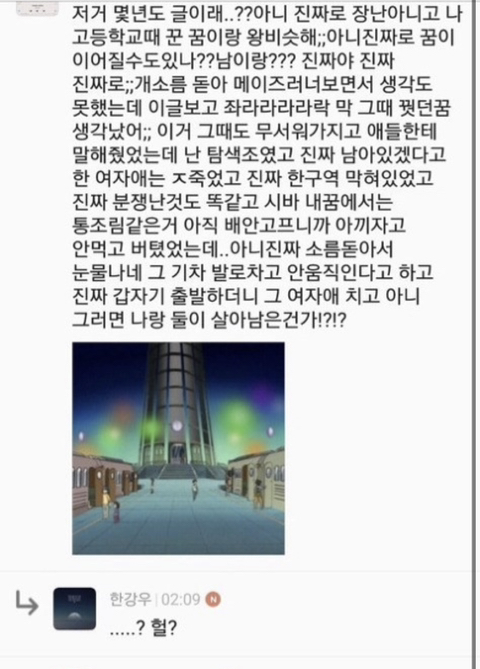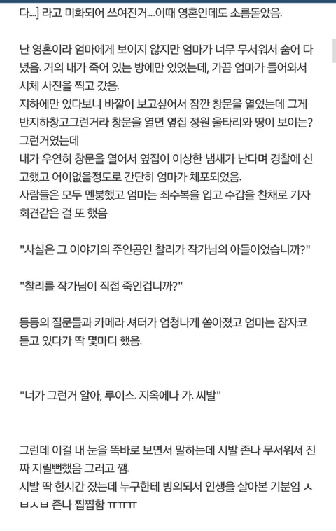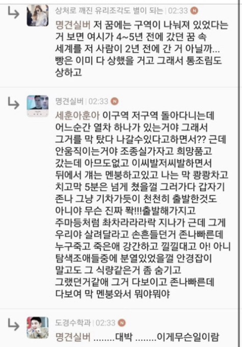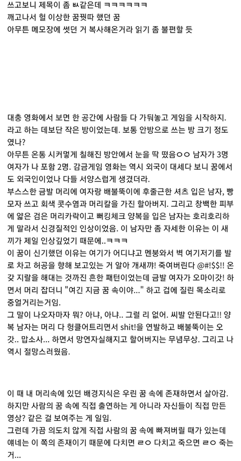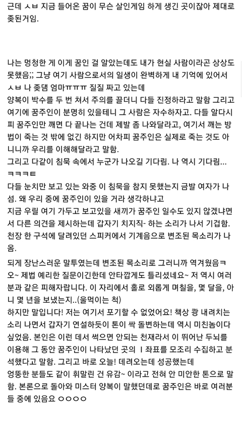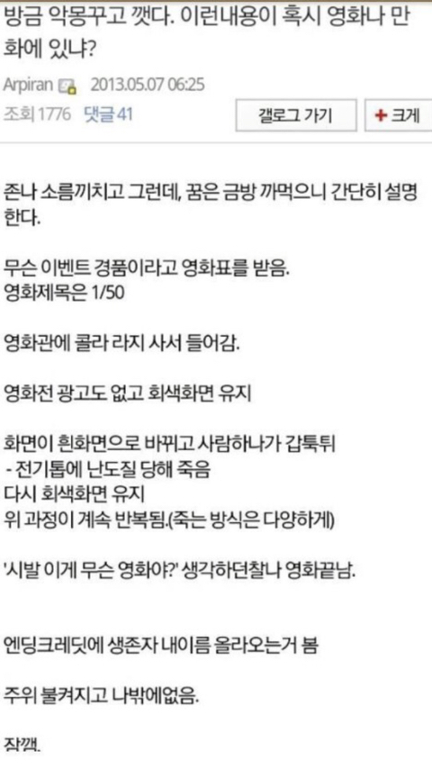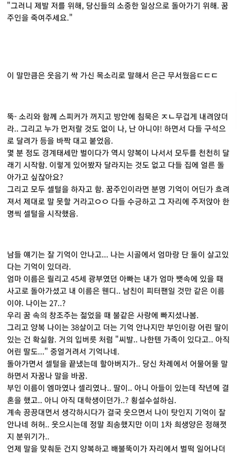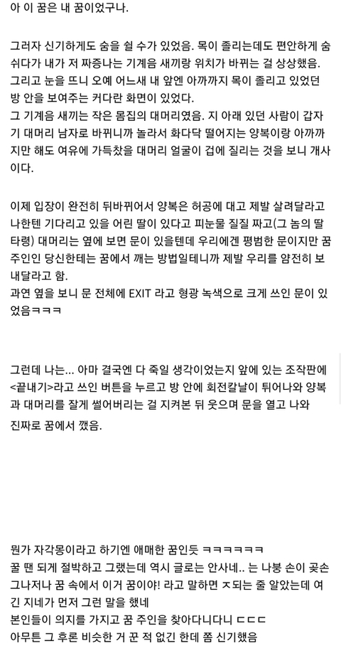 [공포]소름 돋는 레전드 꿈 모음 작성자NCT 태용|작성시간23.05.27|조회수5,015 목록 댓글 6 글자크기 작게가 글자크기 크게가 내가 제일 좋아하는 꿈들로만 모았어!! ** 방금 악몽 꾸고 깼다. 이런 내용이 혹시 영화나 만화에 있냐?소름 돋고 찝찝한 꿈꿈 속 사람들이 꿈 주인을 찾는 꿈 꾼 적 있다배틀로얄 꿈악령된 꿈레전드 지하철 꿈+++ 지하철 꿈에 달린 댓글 꿈이랑 연결된 스토리를 꾼 사람이 나타남 다음검색 현재 게시글 추가 기능 열기 북마크 공유하기 신고 센터로 신고 댓글 댓글 6 댓글쓰기 답글쓰기 댓글 리스트 작성자쮜엑 | 작성시간 23.05.27 이거랑 그 꿈중독도 재밌잔아 꿈 이야기 너무 좋아 작성자나루 | 작성시간 23.05.27 와 다 너무 재밌다 작성자퀸칼ㄷ | 작성시간 23.05.27 나는 개인적으로 악령꿈이 제일 소름임 실제로 웃는 귀신이 제일 위험하다는데 저건 상상이 아니라 ㄹㅇ 악령이엇다가 되돟아온거같음;; 작성자윤우 | 작성시간 23.05.27 악령이랑 마지막 지하철꿈 내 최애 작성자훈훈 | 작성시간 23.05.27 와...진짜 대박 댓글 전체보기