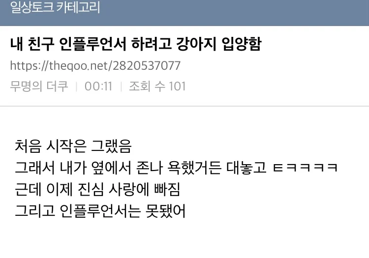 [기타]내친구 인플루언서 하려고 강아지 입양함 작성자뀨닝즈|작성시간23.06.04|조회수29,201 목록 댓글 11 글자크기 작게가 글자크기 크게가 출처 : https://theqoo.net/2820812351 결론은 사두용미 ㅇㅇ예쁜사랑 하세요🐶❤️ 다음검색 현재 게시글 추가 기능 열기 북마크 공유하기 신고 센터로 신고 댓글 댓글 11 댓글쓰기 답글쓰기 댓글 리스트 작성자퇴사가답이다 | 작성시간 23.06.12 진짜 넘 다행 작성자Toystoryyy | 작성시간 23.06.14 다행 작성자호로리 | 작성시간 23.06.18 다행이ㅔ 작성자에너지바 | 작성시간 23.06.18 다행 작성자복길 | 작성시간 23.06.22 다행이다 댓글 전체보기
