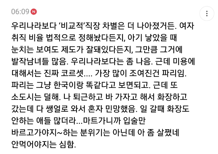 프랑스가 무조건 우리보다 나쁘다는거 아님, 걍 우리랑 비교를 떠나서 이런 면도 있다는것임.