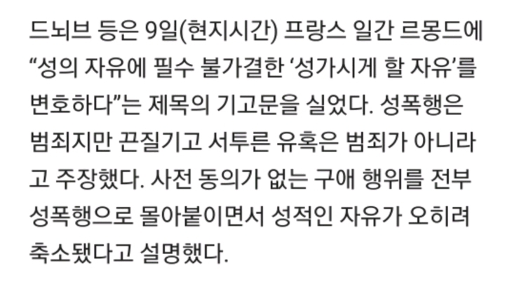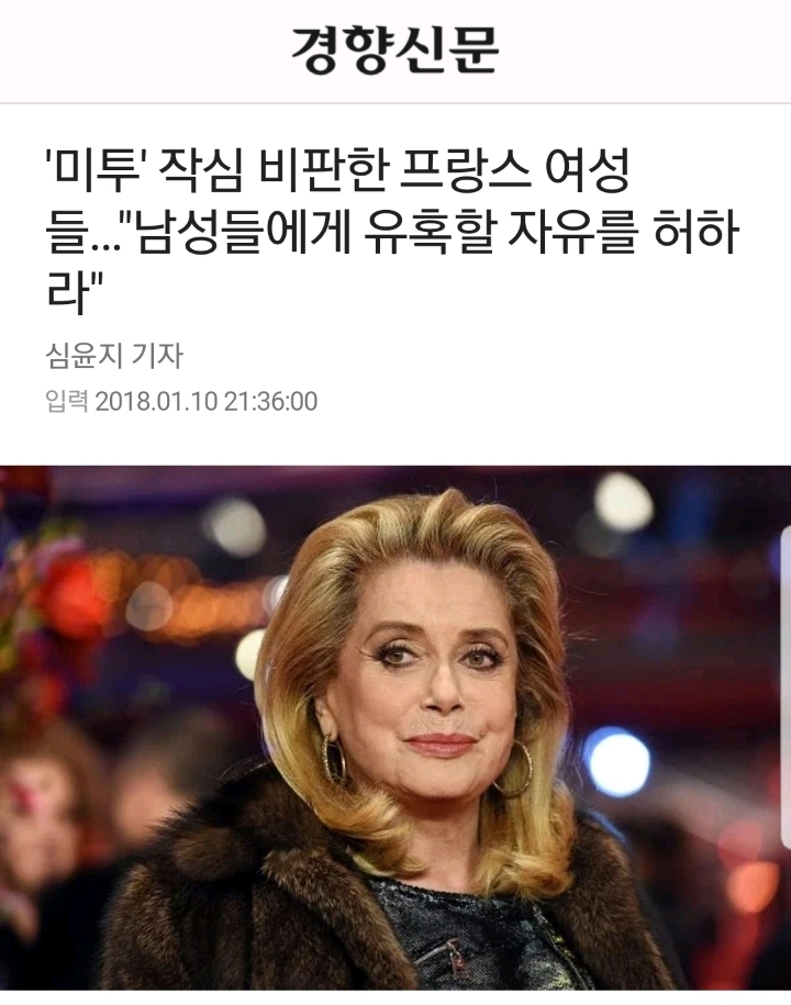 프랑스 여성들이 미투운동이 유혹할 권리(....ㅋ)를 해친다며 유명신문에 칼럼 기고하기도 함