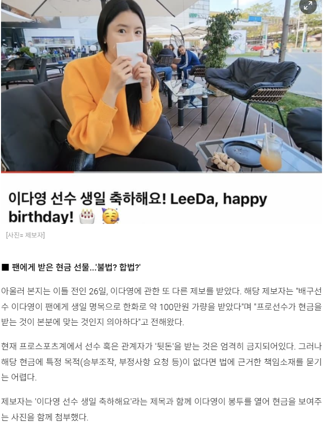 최근 이다영이 팬에게 100만원을 받았다는 기사가 남