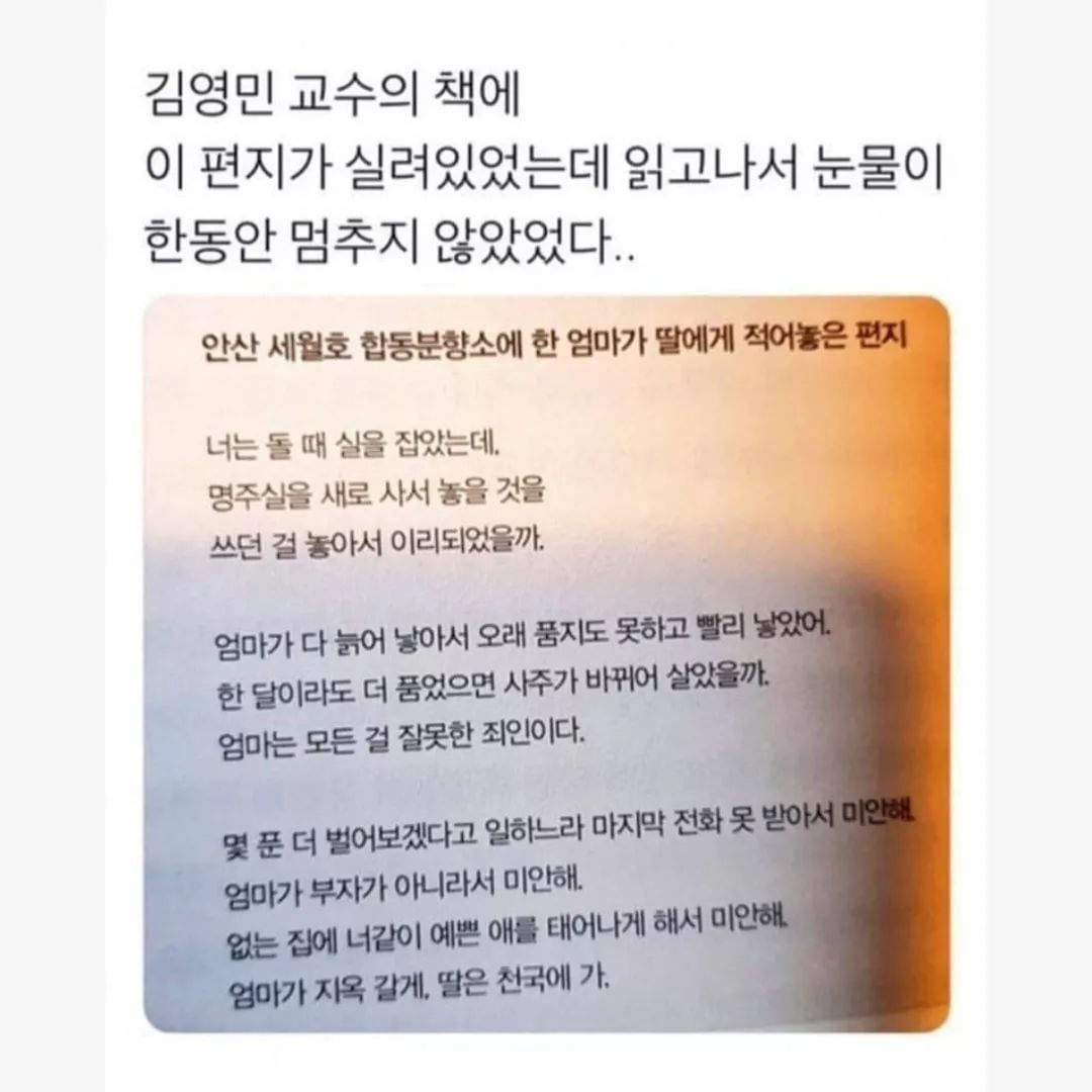[기타]너는 돌 때 실을 잡았는데, 명주실을 새로 사서 놓을 것을 쓰던 걸 놓아서 이리되었을까 작성자뀨닝즈|작성시간23.09.07|조회수771 목록 댓글 7 글자크기 작게가 글자크기 크게가 ㅠㅠ 다음검색 현재 게시글 추가 기능 열기 북마크 공유하기 신고 센터로 신고 댓글 댓글 7 댓글쓰기 답글쓰기 댓글 리스트 작성자딸기냥냥 | 작성시간 23.09.07 작성자KIA 타이거즈 | 작성시간 23.09.07 진짜 너무 마음 아파.. 꼭 좋은곳에 있기를... 작성자망글곰은수영중 | 작성시간 23.09.07 아 존나 눈물나ㅠ 작성자망글곰은수영중 | 작성시간 23.09.07 아 존나 눈물나ㅠ 작성자마르셸린 | 작성시간 23.09.07 이건 정말 볼때마다 눈물나 댓글 전체보기